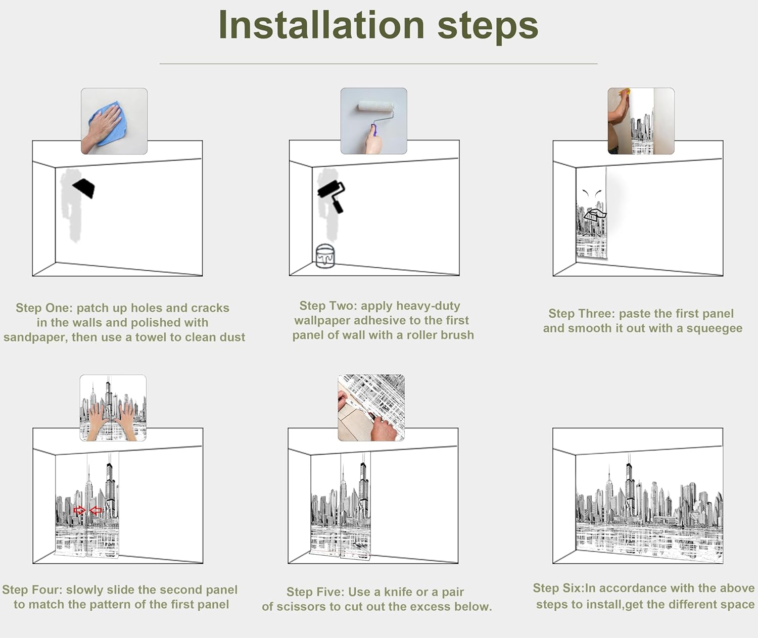 • INSTALLATION - 1.Fill in all cracks or holes and clean dust dirt and grease on the wall surface. 2. Apply the heavy duty wallpaper paste on the wall not mural. 3. Use a spirit level to mark first strip location. 4. match the pattern by sliding into place. 5.use a scraper to smooth out bubbles press. 6. Let dry for a few minutes and that's it! Please Note: Not self-adhesive. We recommend to use a standardized fleece wallpaper paste.