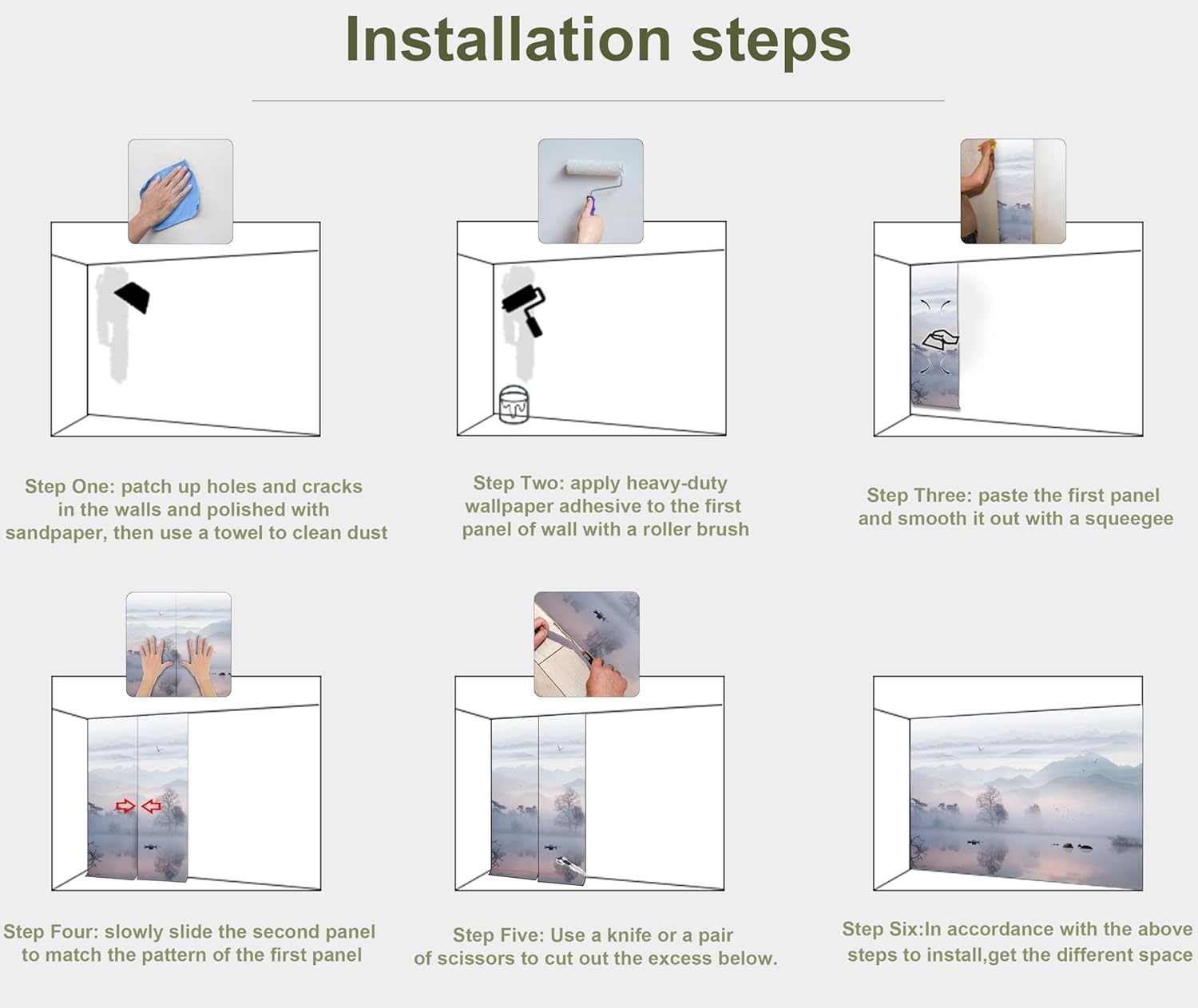 • INSTALLATION - 1.Fill in all cracks or holes and clean dust dirt and grease on the wall surface. 2. Apply the heavy duty wallpaper paste on the wall not mural. 3. Use a spirit level to mark first strip location. 4. match the pattern by sliding into place. 5.use a scraper to smooth out bubbles press. 6. Let dry for a few minutes and that's it! Please Note: Not self-adhesive. We recommend to use a standardized fleece wallpaper paste.