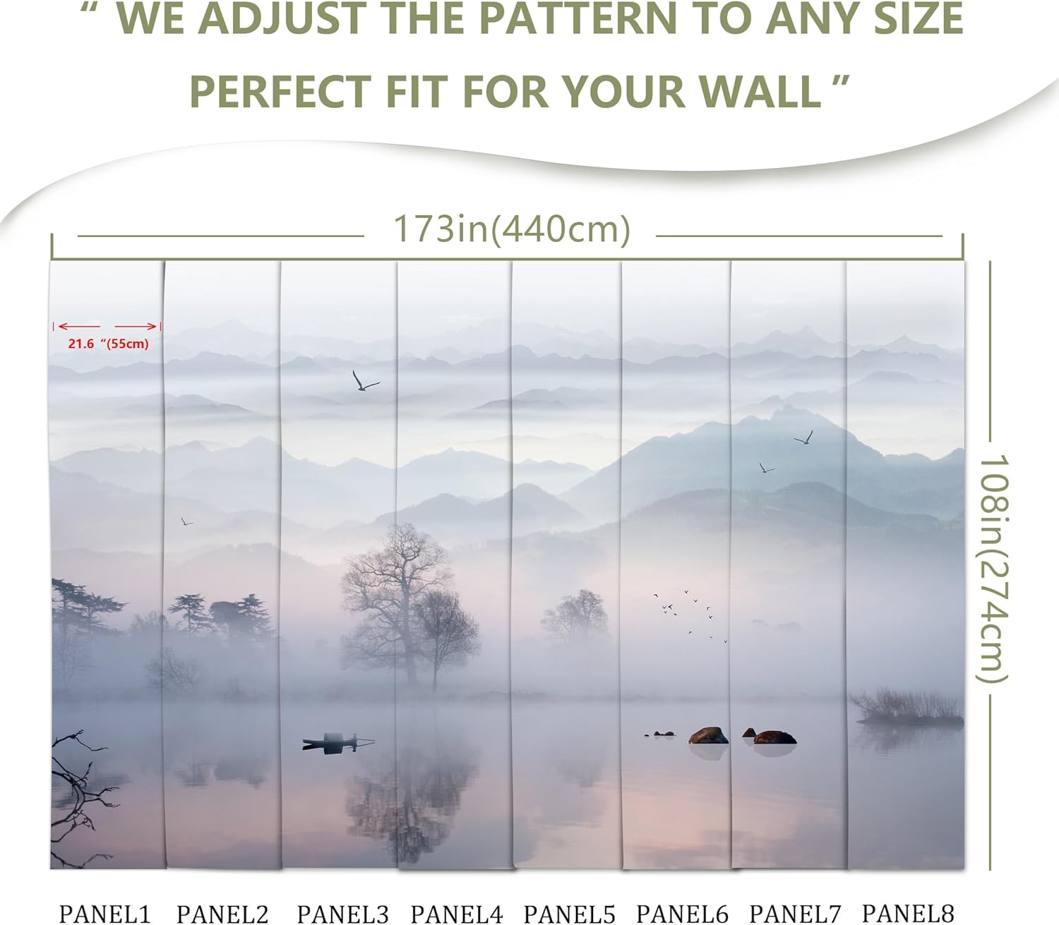 • MURAL SIZE - Approx.173"x108"(Wx H), This mural wallpaper cut into 8 strips. All is marked with number under each strip. You can put it in sequential order before you install it