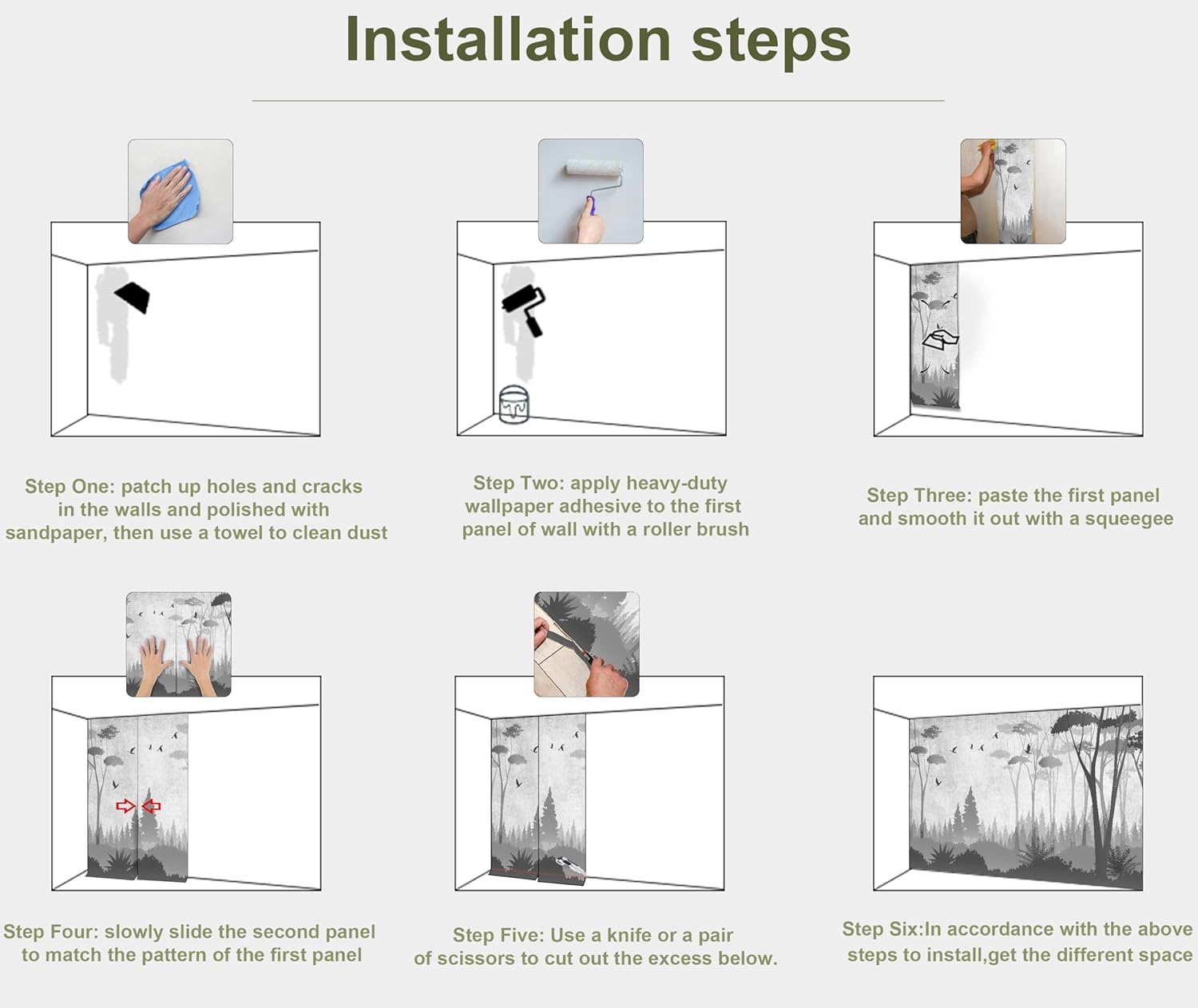 • INSTALLATION - 1.Fill in all cracks or holes and clean dust dirt and grease on the wall surface. 2. Apply the heavy duty wallpaper paste on the wall not mural. 3. Use a spirit level to mark first strip location. 4. match the pattern by sliding into place. 5.use a scraper to smooth out bubbles press. 6. Let dry for a few minutes and that's it! Please Note: Not self-adhesive. We recommend to use a standardized fleece wallpaper paste.