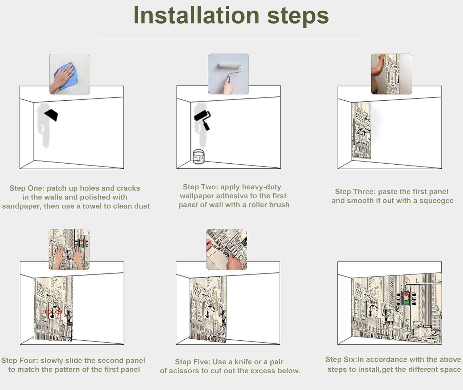 • INSTALLATION - 1.Fill in all cracks or holes and clean dust dirt and grease on the wall surface. 2. Apply the heavy duty wallpaper paste on the wall not mural. 3. Use a spirit level to mark first strip location. 4. match the pattern by sliding into place. 5.use a scraper to smooth out bubbles press. 6. Let dry for a few minutes and that's it! Please Note: Not self-adhesive. We recommend to use a standardized fleece wallpaper paste.