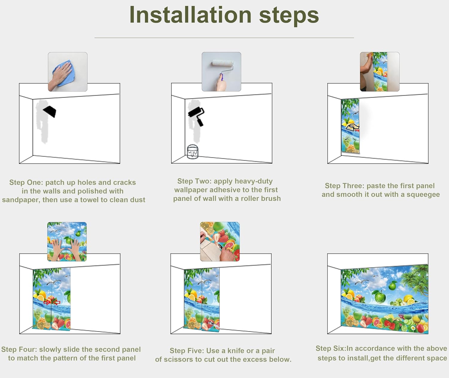 • INSTALLATION - 1.Fill in all cracks or holes and clean dust dirt and grease on the wall surface. 2. Apply the heavy duty wallpaper paste on the wall not mural. 3. Use a spirit level to mark first strip location. 4. match the pattern by sliding into place. 5.use a scraper to smooth out bubbles press. 6. Let dry for a few minutes and that's it! Please Note: Not self-adhesive. We recommend to use a standardized fleece wallpaper paste.