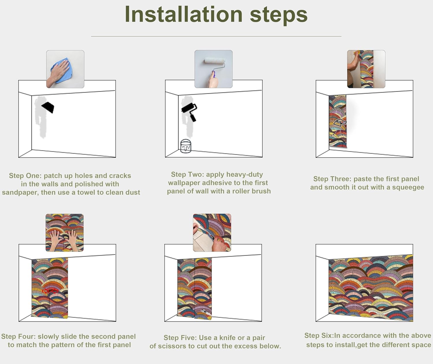 • INSTALLATION - 1.Fill in all cracks or holes and clean dust dirt and grease on the wall surface. 2. Apply the heavy duty wallpaper paste on the wall not mural. 3. Use a spirit level to mark first strip location. 4. match the pattern by sliding into place. 5.use a scraper to smooth out bubbles press. 6. Let dry for a few minutes and that's it! Please Note: Not self-adhesive. We recommend to use a standardized fleece wallpaper paste.