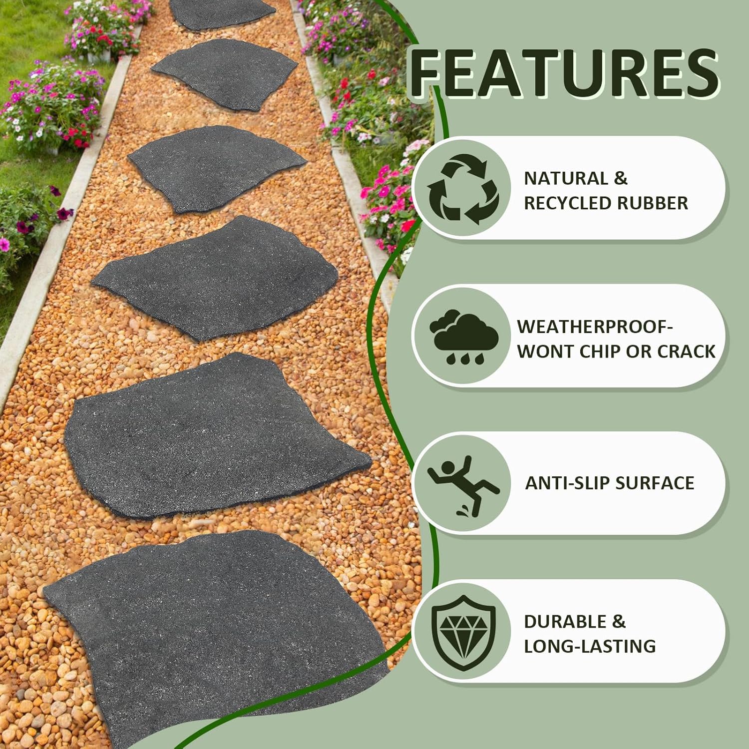 • DURABLE: Made from recycled rubber, these stepping stones outdoor are heavy enough to stay put in place and durable to withstand all weather condition.