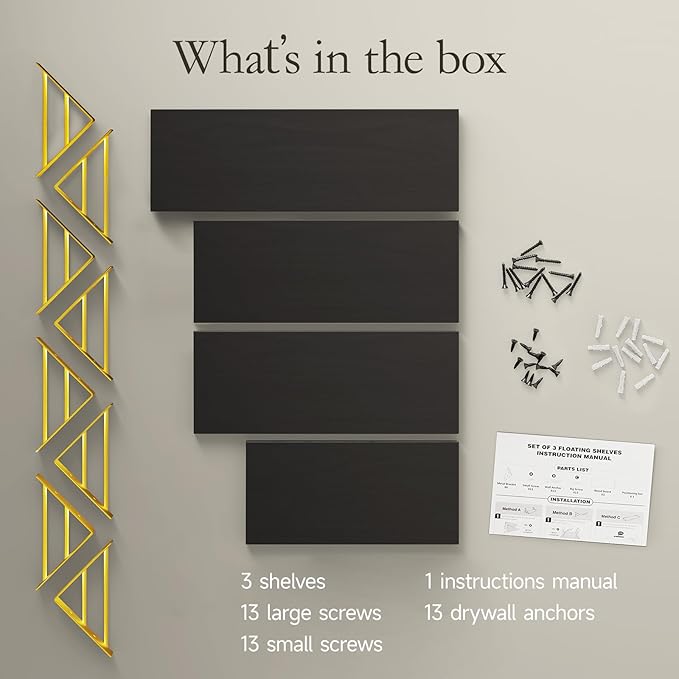 • Organize your space with our wall mounted shelves. These Black Gold shelves are perfect for bedrooms, bathrooms, or living rooms. With their sleek design and easy installation, they are ideal for any room, providing both practicality and a stylish touch