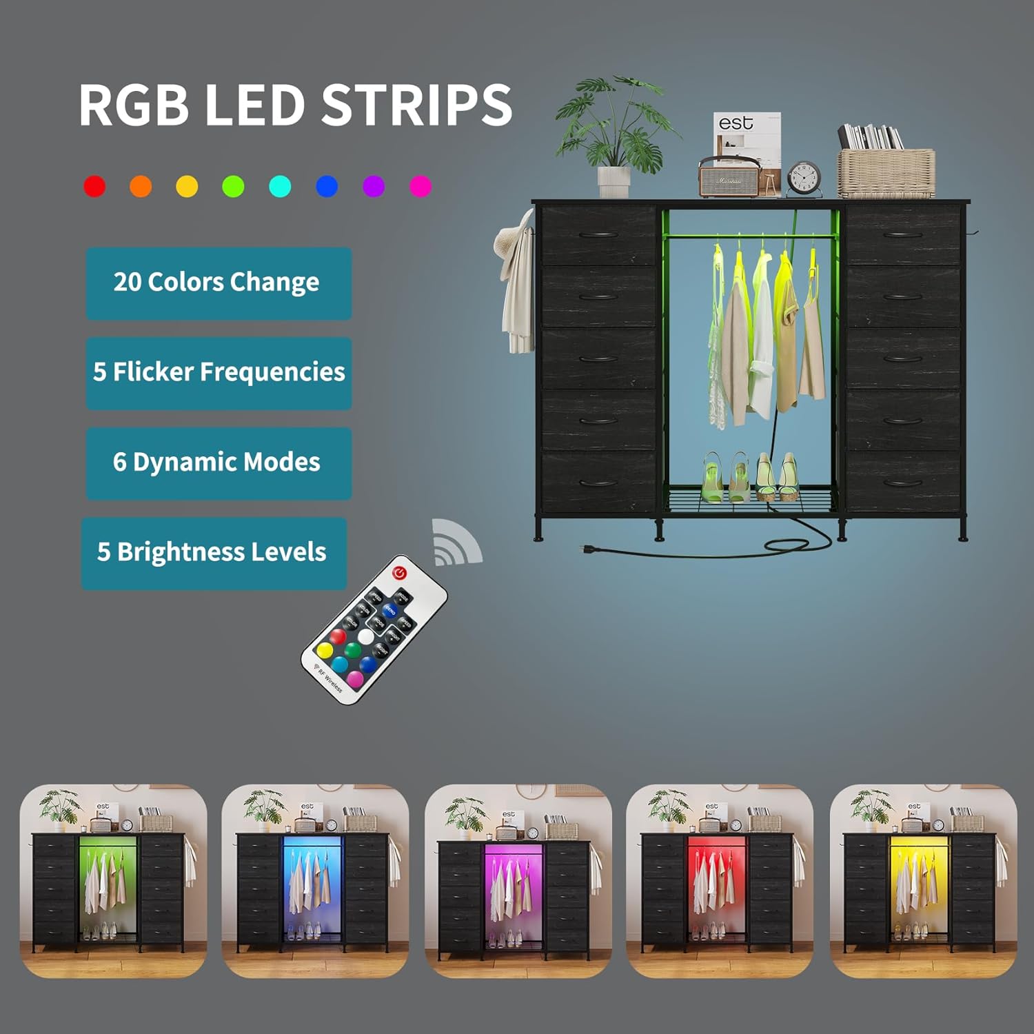 LUMTOK 55" W 2-in-1 Dresser with Hanging Rack, 10 Drawers Dresser for Bedroom,Dressers with Fabric Drawers,LED Lights, Charging Station and Hanging Racks for Bedroom