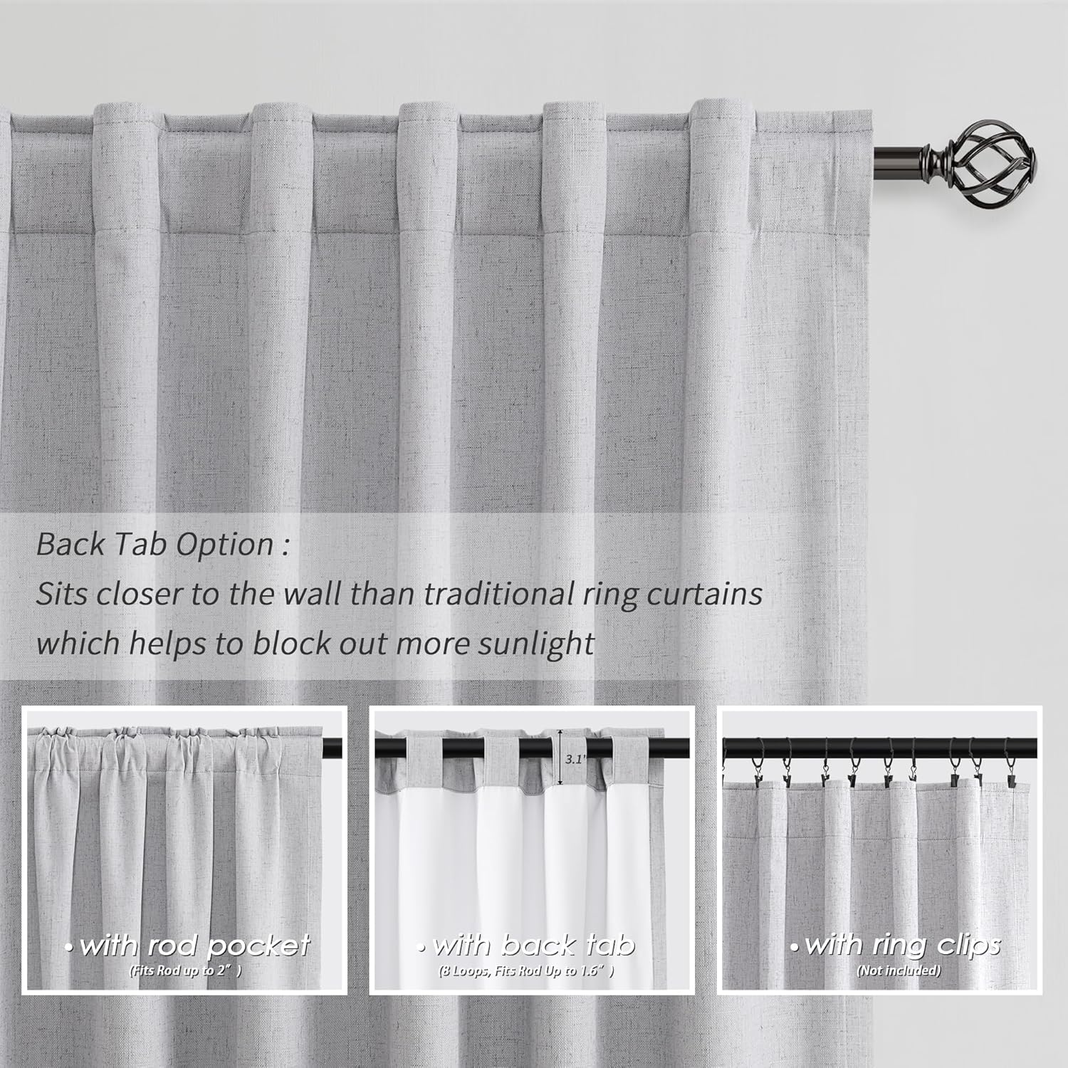 • 3 Hanging Options: Differ from the traditional curtains with grommet, BOODII linen curtains with back tab and rod pocket can full block sunlight fully. (1) Using the back tabs design to create an elegant pleated look and sit closer to the wall than traditional ring curtains, which helps to block out more sunlight; (2) Using rod pocket for a classic effect; (3) Using clip rings on track system or curtain rod, slide open/closed easily (clip rings are not included).