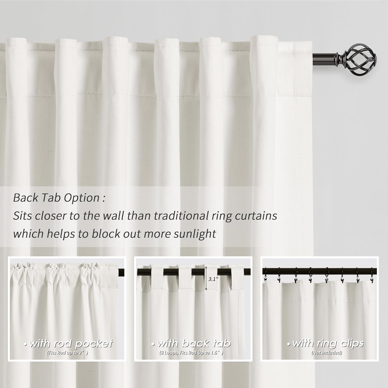 • 3 Hanging Options: Differ from the traditional curtains with grommet, BOODII linen curtains with back tab and rod pocket can full block sunlight fully. (1) Using the back tabs design to create an elegant pleated look and sit closer to the wall than traditional ring curtains, which helps to block out more sunlight; (2) Using rod pocket for a classic effect; (3) Using clip rings on track system or curtain rod, slide open/closed easily (clip rings are not included).