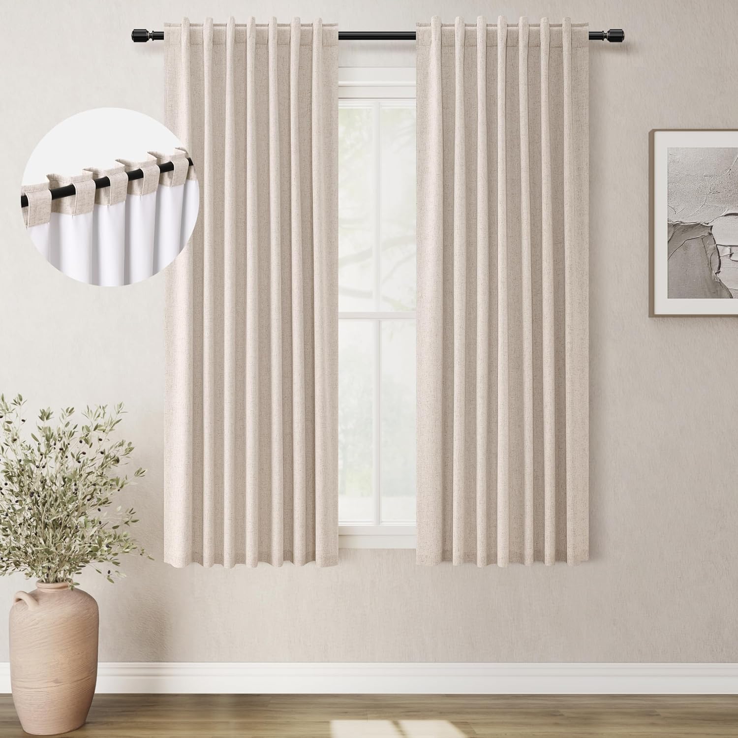 • 3 Hanging Options: Differ from the traditional curtains with grommet, BOODII linen curtains with back tab and rod pocket can full block sunlight fully. (1) Using the back tabs design to create an elegant pleated look and sit closer to the wall than traditional ring curtains, which helps to block out more sunlight; (2) Using rod pocket for a classic effect; (3) Using clip rings on track system or curtain rod, slide open/closed easily (clip rings are not included).