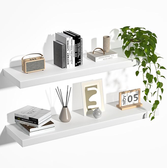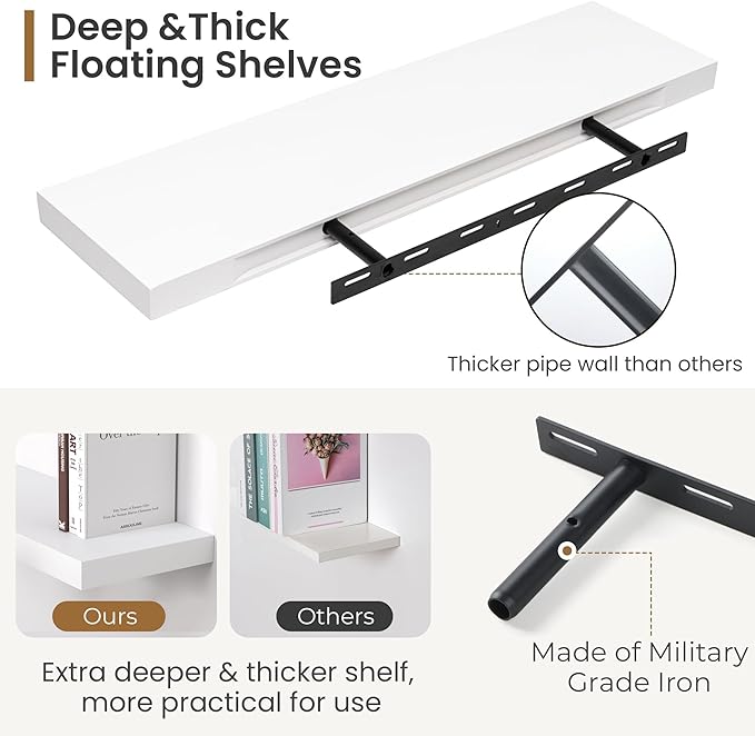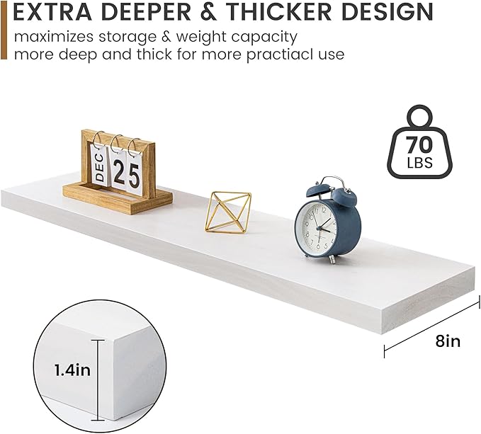 • Extra Deeper & Thicker for Storage - Each board measures 30"W x 8"D x 1.4"H. Extra deeper and thicker design in order to bring maximizes storage space and weight capacity, even hold up to 70 lb. This floating shelf taking up zero square feet, reduces clutter and highlights décor in compact spaces. It can help make full use of the empty wall, making it much more space-saving and making your room look larger and tidier.
