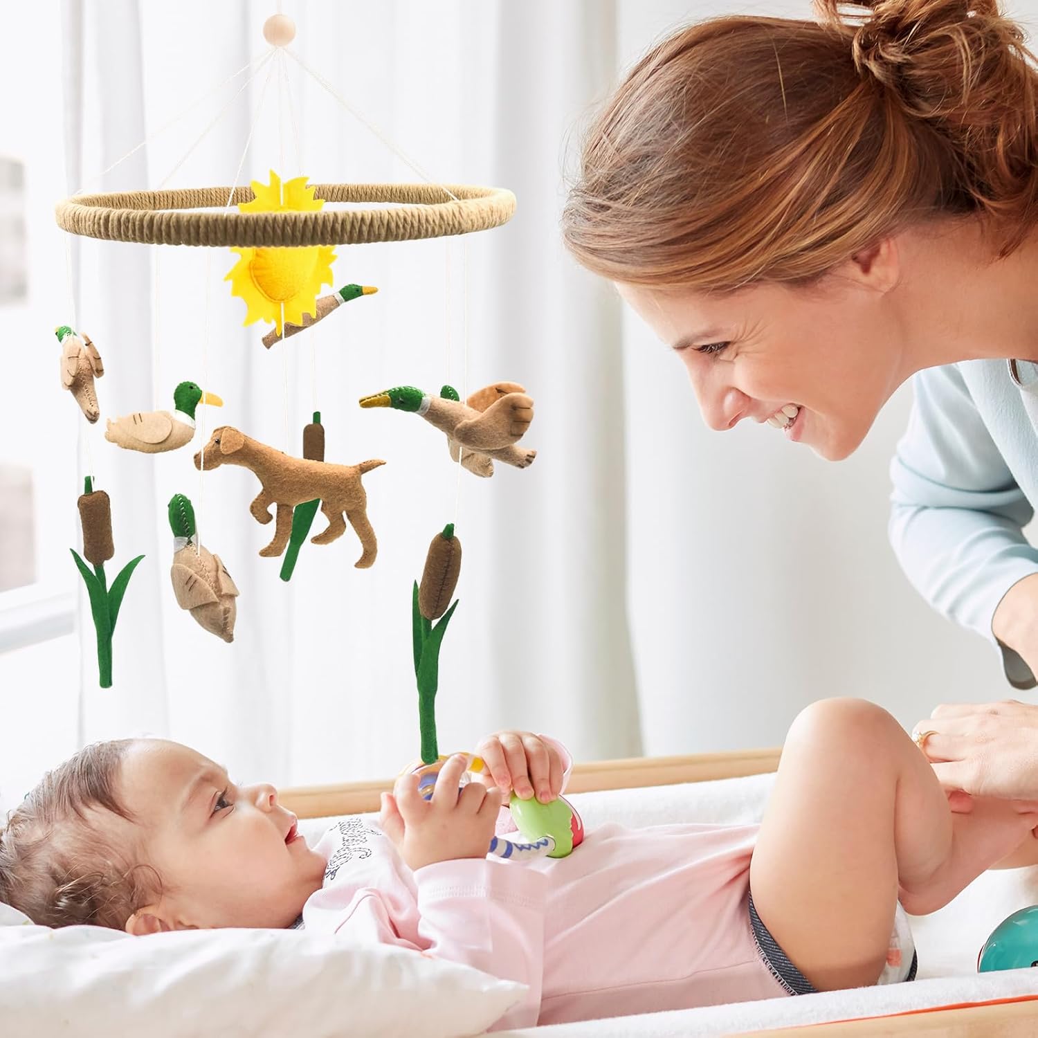Baby Mobile for Crib Mallard Duck Baby Crib Mobile for Boys Girls Handmade Felt Dog Nursery Decor Duck Hunting Decor Infant Toddler Room Hanging for Bassinet Gender Neutral Newborn Gift