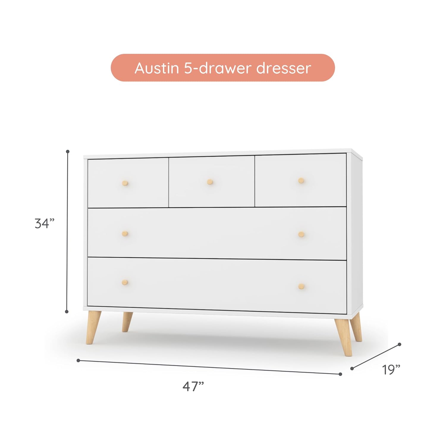 • Show-Stopping 5-Drawer Austin Dresser: Whether paired with the Austin 3-in-1 Convertible Crib or standing alone, this dresser adds undeniable style and storage to any nursery. With sleek rubberwood legs and a sophisticated design, it’s built to be a standout piece that grows with your child.