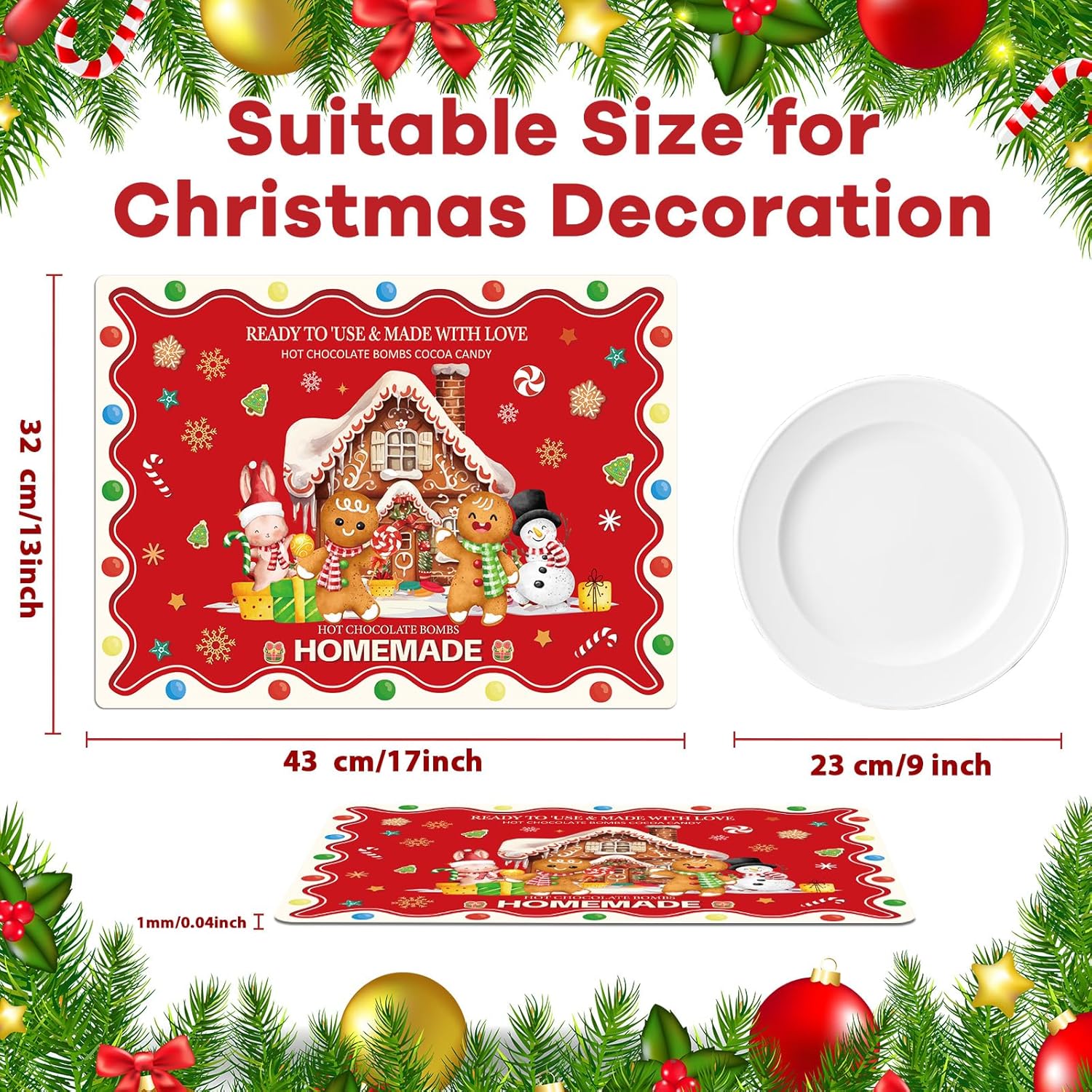 • Christmas placemats set of 6: You will get 6 pieces of Christmas winter plastic placemats. Christmas gingerbread plastic table mats measure 43 x 32cm/17x 13 inches, making it the ideal size to accommodate your Christmas party and events, which allows you to easily decorate your kitchen table mats and create a stunning centerpiece for your Christmas party.