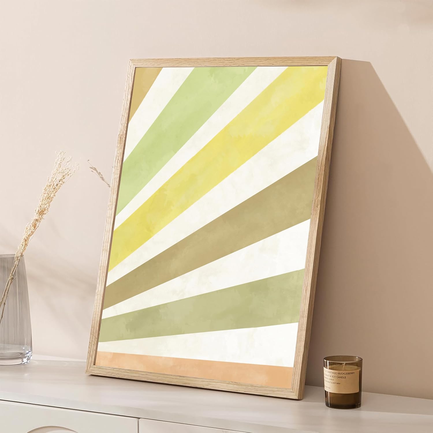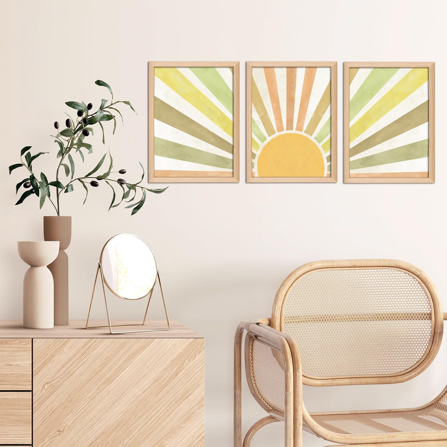 • Boho Wall Art Set of 3 Celebrate the energy of the sun with this Sun Wall Art collection. The bold sunburst pattern, in soft shades of yellow, green, and beige, exudes warmth and positivity that combine abstract sunshine and geometric lines in warm, earthy tones. This set effortlessly complements modern, bohemian, and minimalist decor.