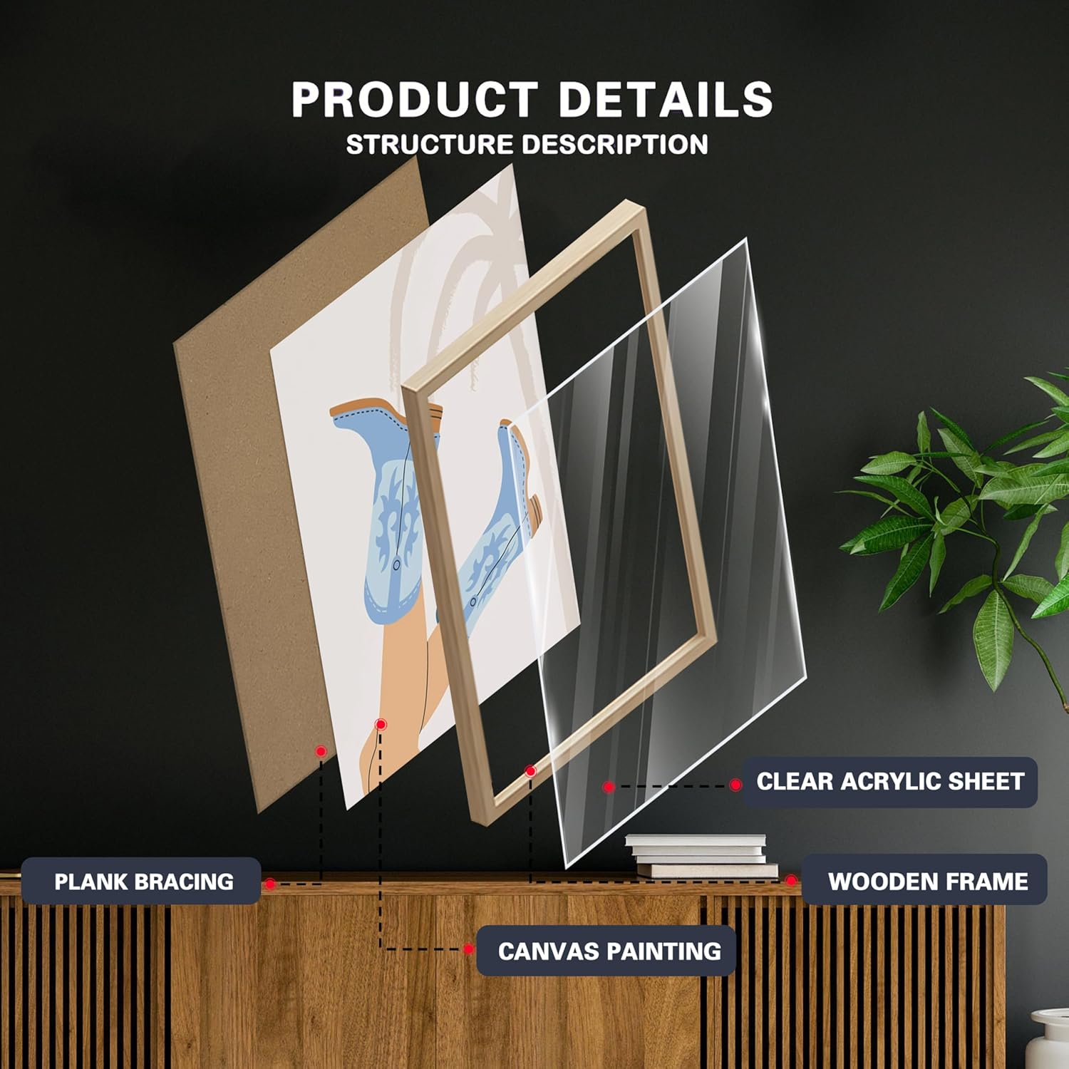 • Cowgirl Boots Wall Art: Each canvas print in this set is wood-framed,With a versatile size of 16x24 inches, perfectly in modern and rustic spaces. The wooden frames enhance the coastal charm while ensuring the prints are durable and ready to hang in your living room, office, or bathroom.