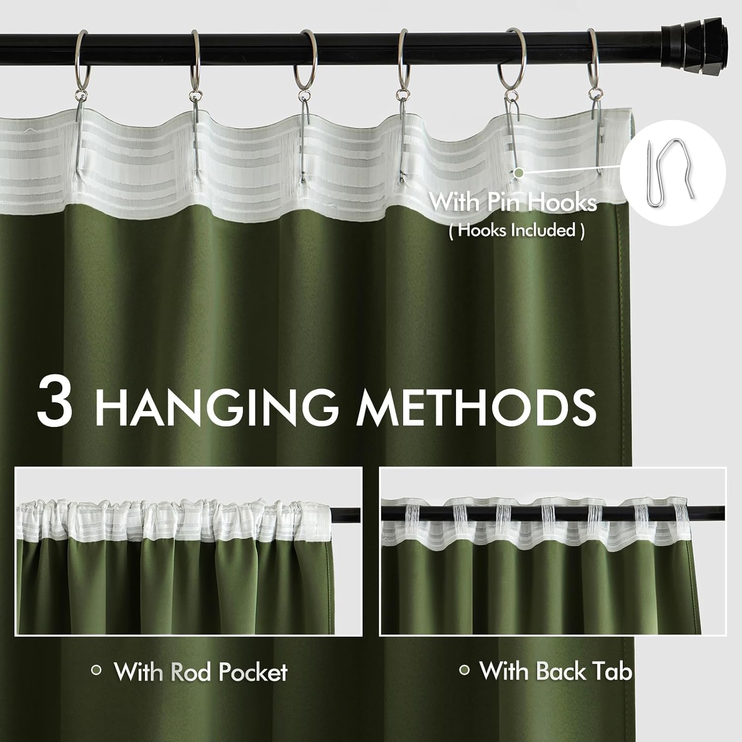 • MULTIPLE HANGING OPTIONS: Each curtain panel features a 3-in-1 top style design: Rod Pocket, Back Tab and Pinch Pleat. The Back loop (2.3 "long) and rod pocket (3.1" long) fit most standard rods. Curtains also can be hung with clip rings or different type of hooks. We will give away 20 pin hooks for each pair of curtains for your convenience (rings won't be included). 3 ways to meet your various needs.
