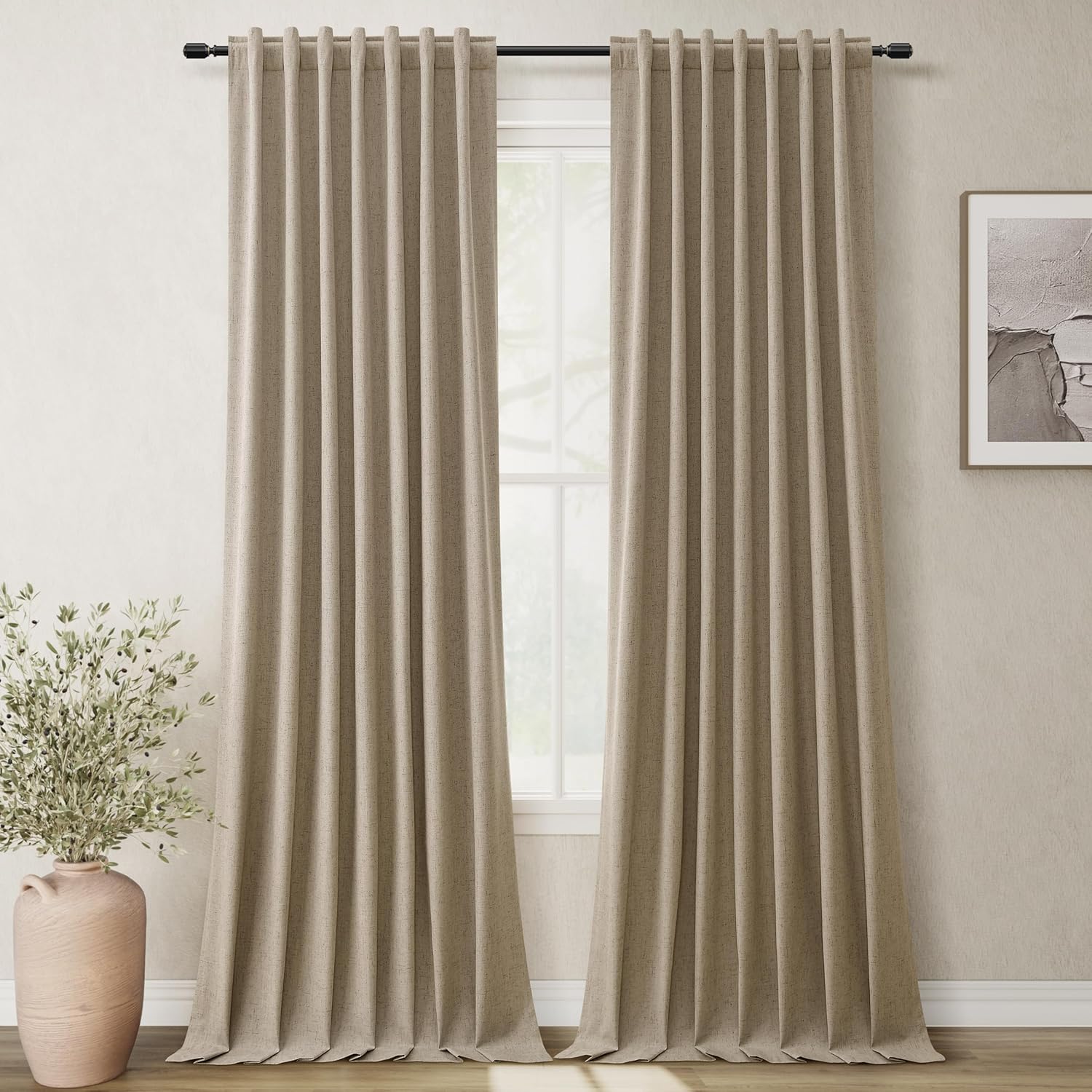 BOODII Room Darkening Curtains Khaki Black Out Curtains 96 Inches Long 2 Panel Set Back Tab Neutral Linen Curtain for Sliding Door Modern Farmhouse Living Room Blackout Drapes Soundproof 52x96
