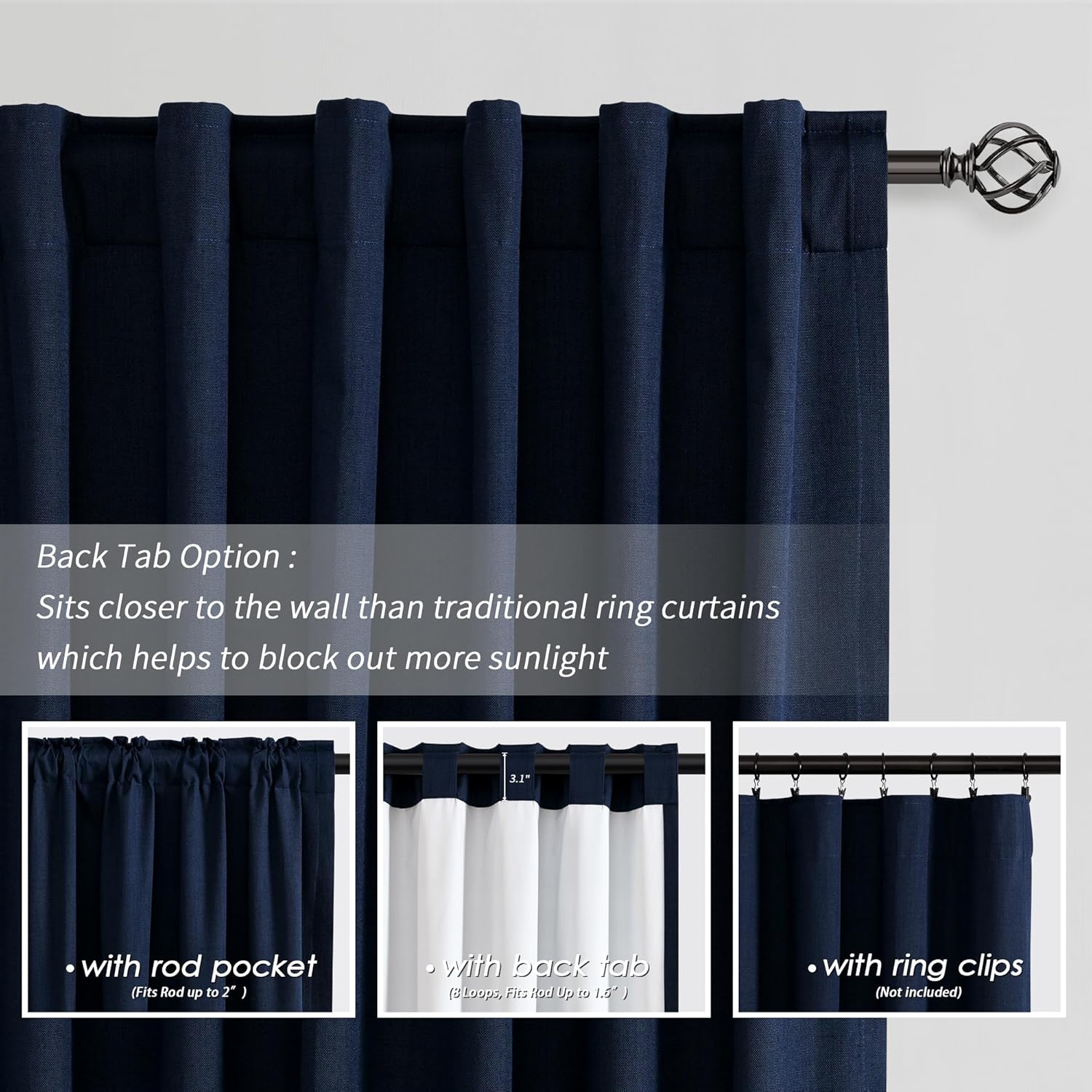 BOODII 100% Blackout Curtains for Bedroom 95 Inch Length 2 Panels Set Room Darkening Linen Curtains Navy Blue Black Out Curtain Thermal Insulated for Living Room Window Drapes Back Tab 52x95