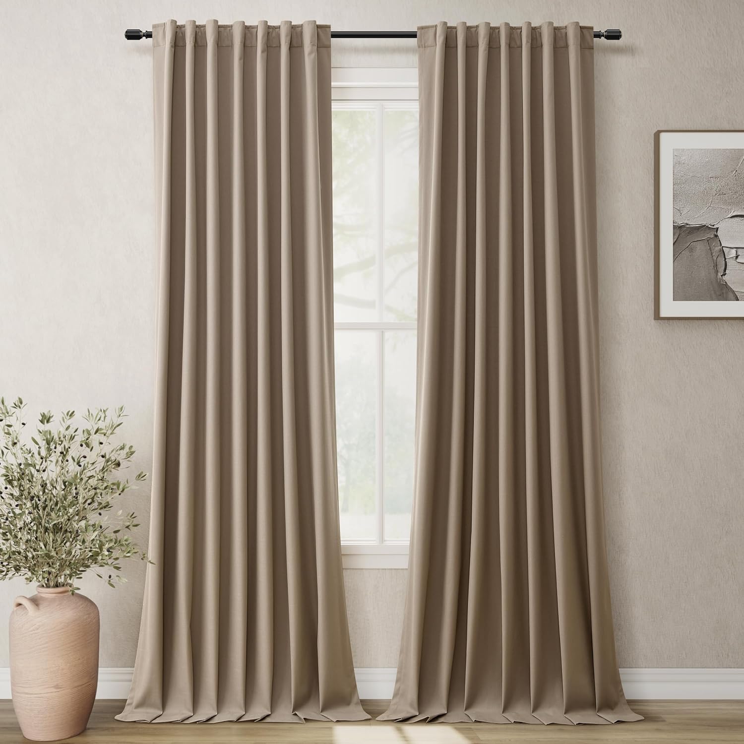 BOODII 100 Inch Blackout Curtains 2 Panels Set Back Tab Thermal Insulated Light Brown Linen Textured Black Out Curtains Noise Reducing Neutral Living Room Darkening Window Drapes Pleated Look 52x100