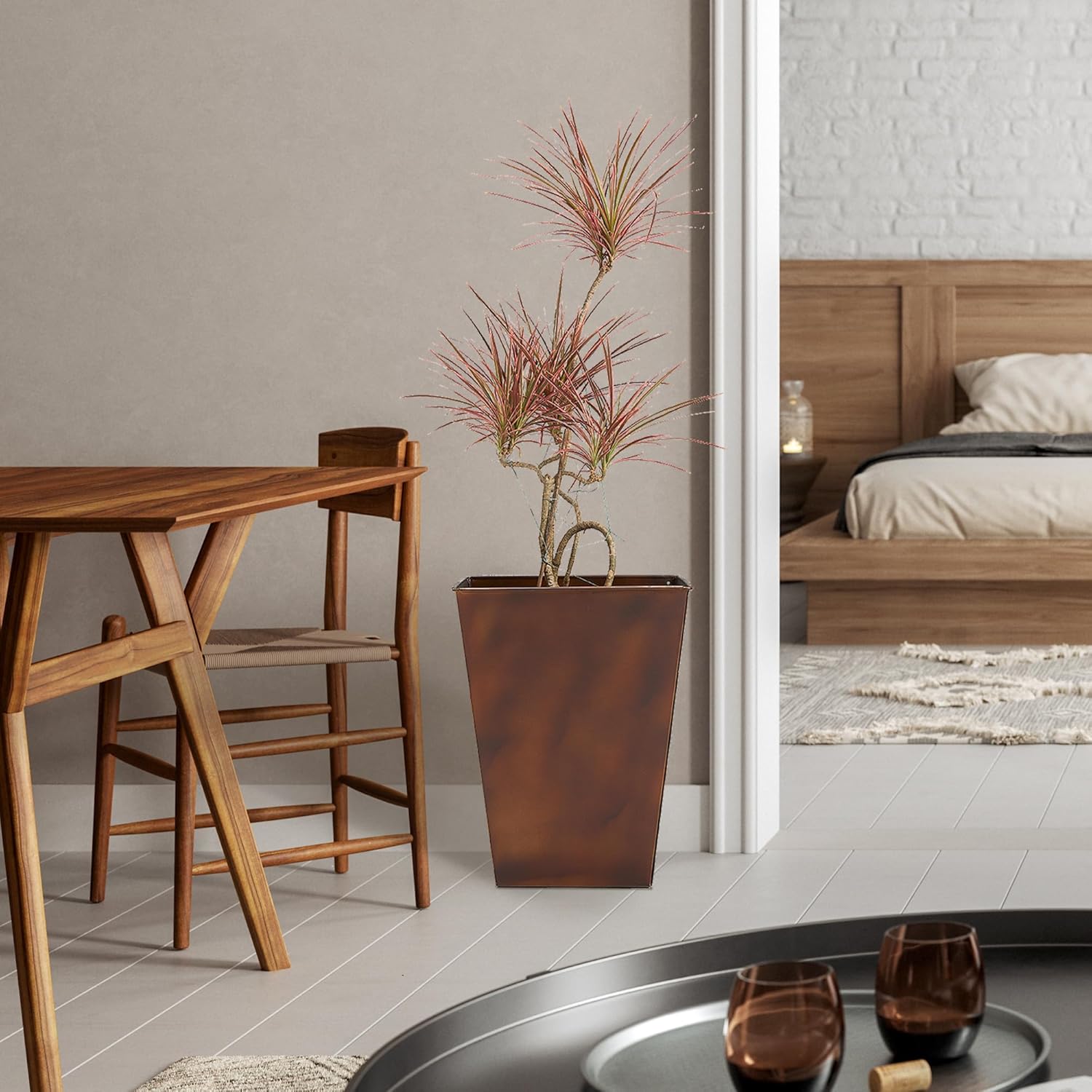 • Stylish Design: WORTH 18" tall square tapered planters feature a matte bronze retro finish; The sleek, retro design seamlessly complements any decor style, making these planters a stylish addition to your home or garden.