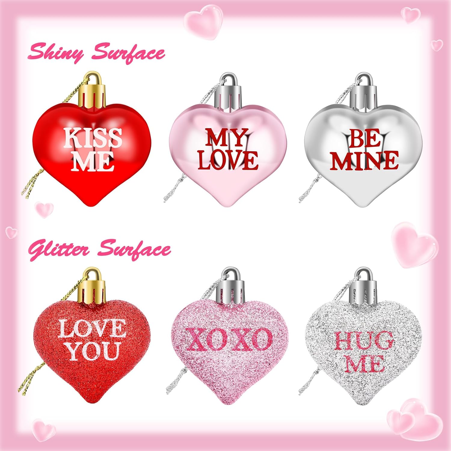 JULMELON 24Pcs Valentine's Day Heart Shaped Ornaments Romantic Valentines Conversation Heart Hanging Ornaments Decorations for Home Party Wedding Decor (Red, Pink and Silver)