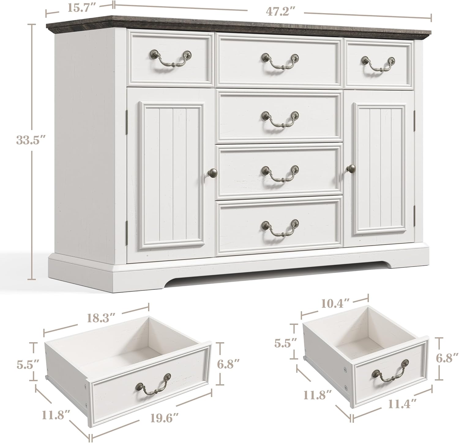 • [Spacious storage]: 47.2"W x 33.5"H x 15.7"D. The white dresser features 6 deep drawers for ample storage space. Great for bedroom,living room and entryway.Besides, the dresser for bedroom features 2 groove doors, offering versatile storage options and ample space for all your needs. Whether it's large towels or small jewelry boxes, you can keep your space tidy with easet.