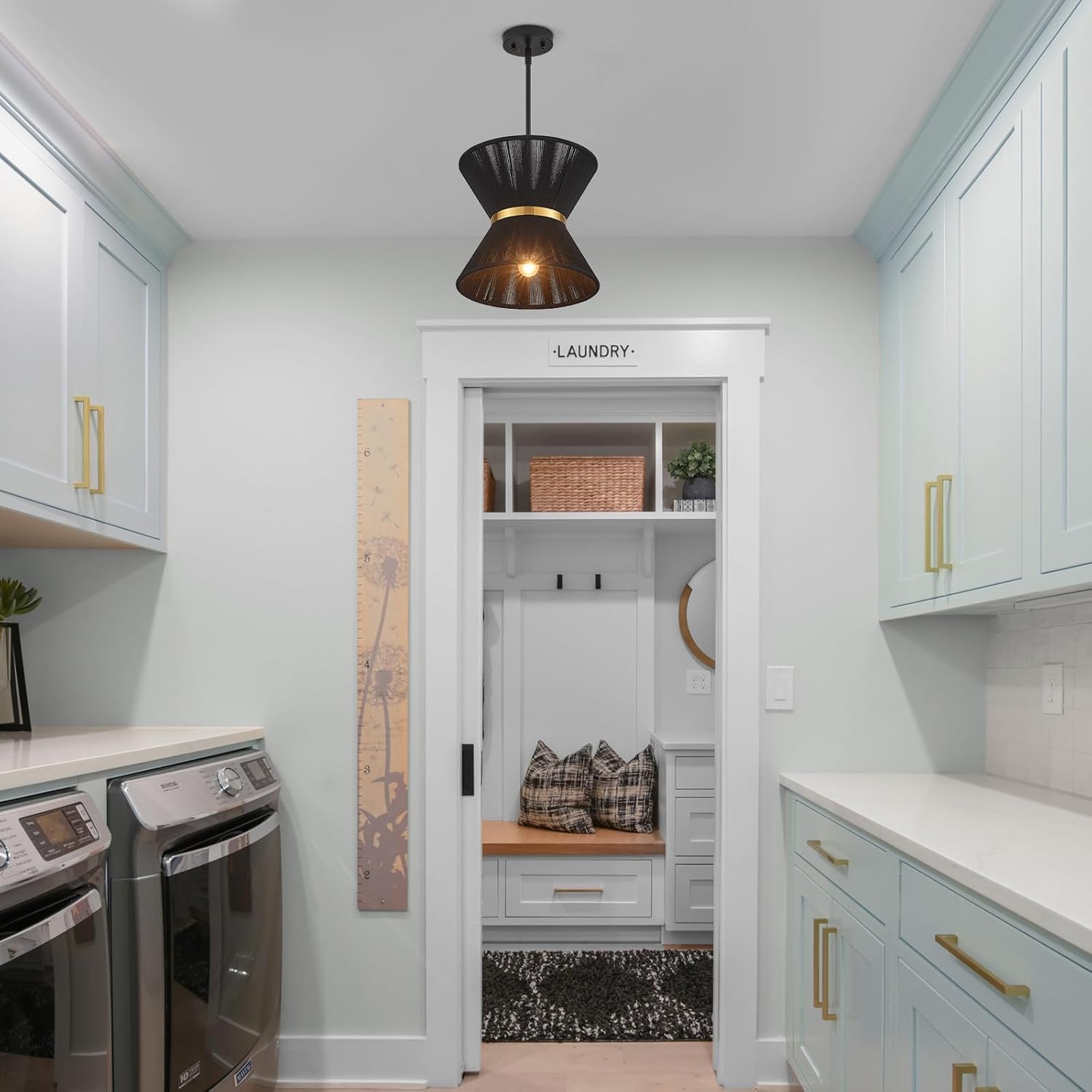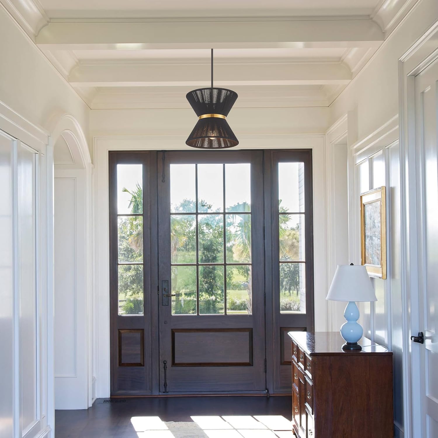 Hand Woven Boho Pendant Light Coastal Mini Modern Chandelier Adjustable Transitional Minimalist Pendant Lighting Fixtures for Kitchen Island Dining Room, Black, Dia 12.2”, UL Listed