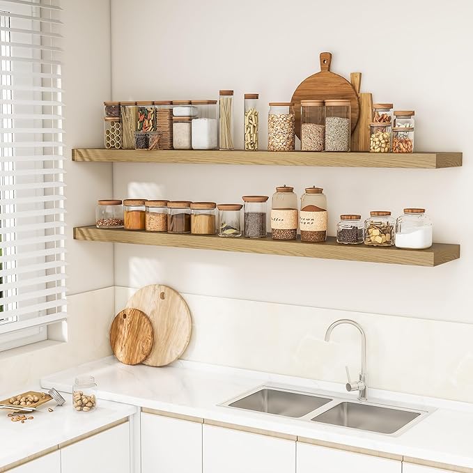 RICHFOCUS 72Inch Floating Shelves for Wall 2 Pack Shelves for Bedroom|Kitchen|Bathroom Wall Mounted Rustic Wood Floating Shelf with Invisible Brackets for Books|Storage|Decor, Oak