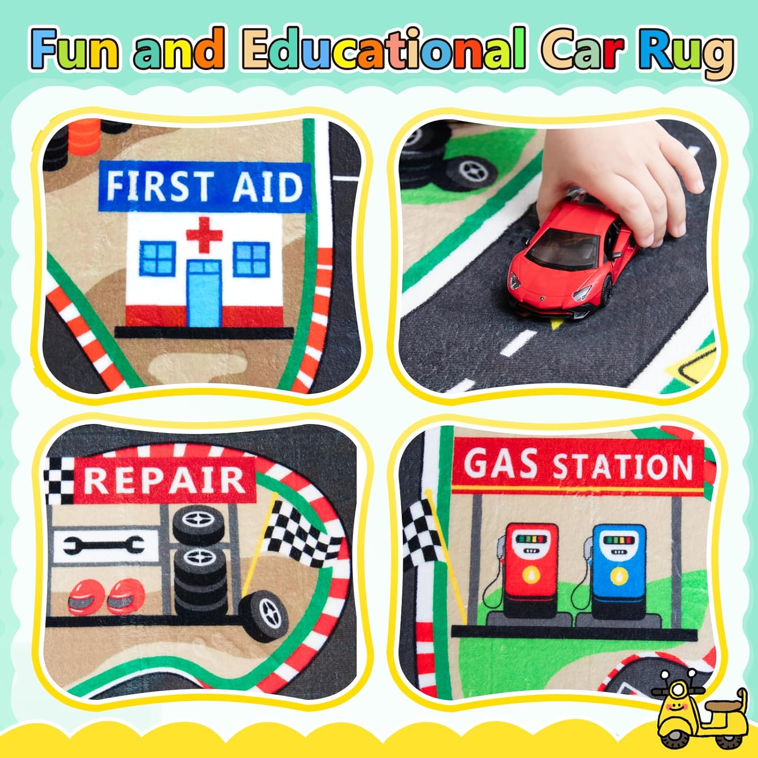 • [Unique Design]: This race track rug features a realistic 3D cascading surround route, complete with a start, and Finish line markings. The car rug is perfect for kids who enjoy playing with race cars. The vibrant colors enhance indoor play, creating an exciting outdoor experience at home.