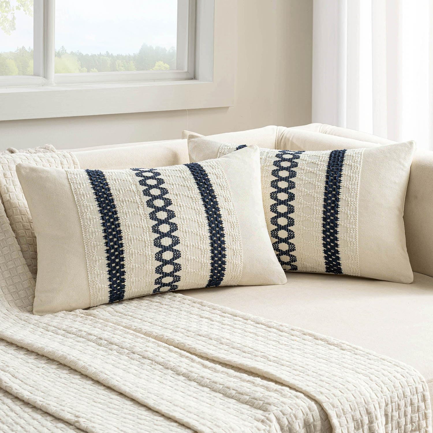 MIULEE Set of 2 Navy Blue Boho Decorative Lumbar Pillow Covers 12x20 Inch Farmhouse Rustic Couch Throw Pillows Modern Cotton Cushion Covers Retro Cute Macrame Woven Home Decor for Bed Sofa Chair