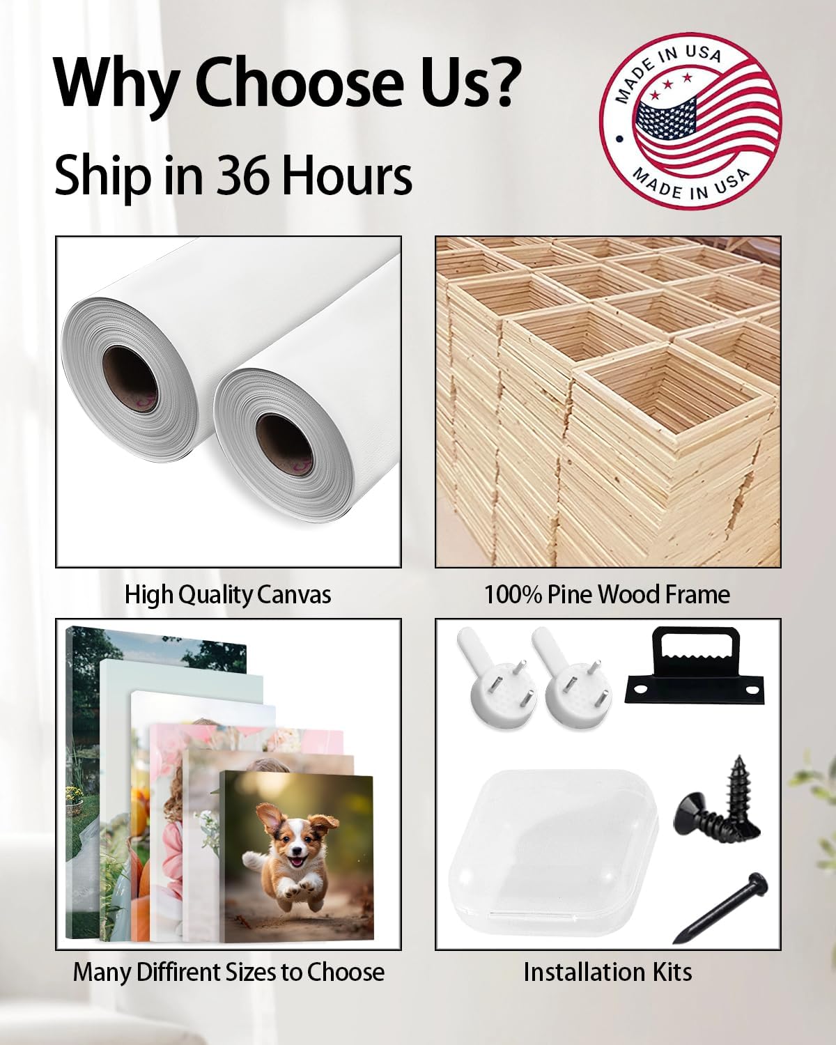 • 【Made in USA】:Our canvas art wall decor are made in the USA.We are committed to fast manufacture of your precious canvas prints, ensuring satisfaction for every home decor project or celebration