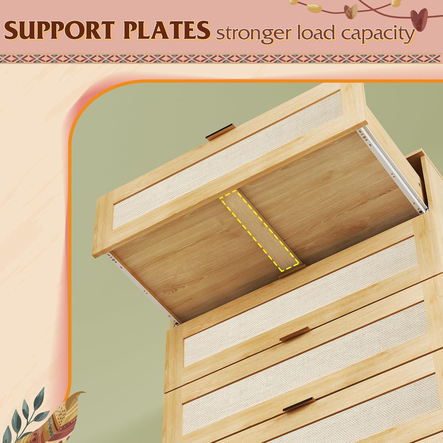 • 🎄【Boho 5 Drawers Dresser】This wooden dresser is made of light wood with wood texture and warm color. The surface of each drawer is decorated with a rattan texture, and the metal handle is smooth and durable. The boho dresser can be used for bedroom clothing organizer, entryway table, decorative storage for living room.