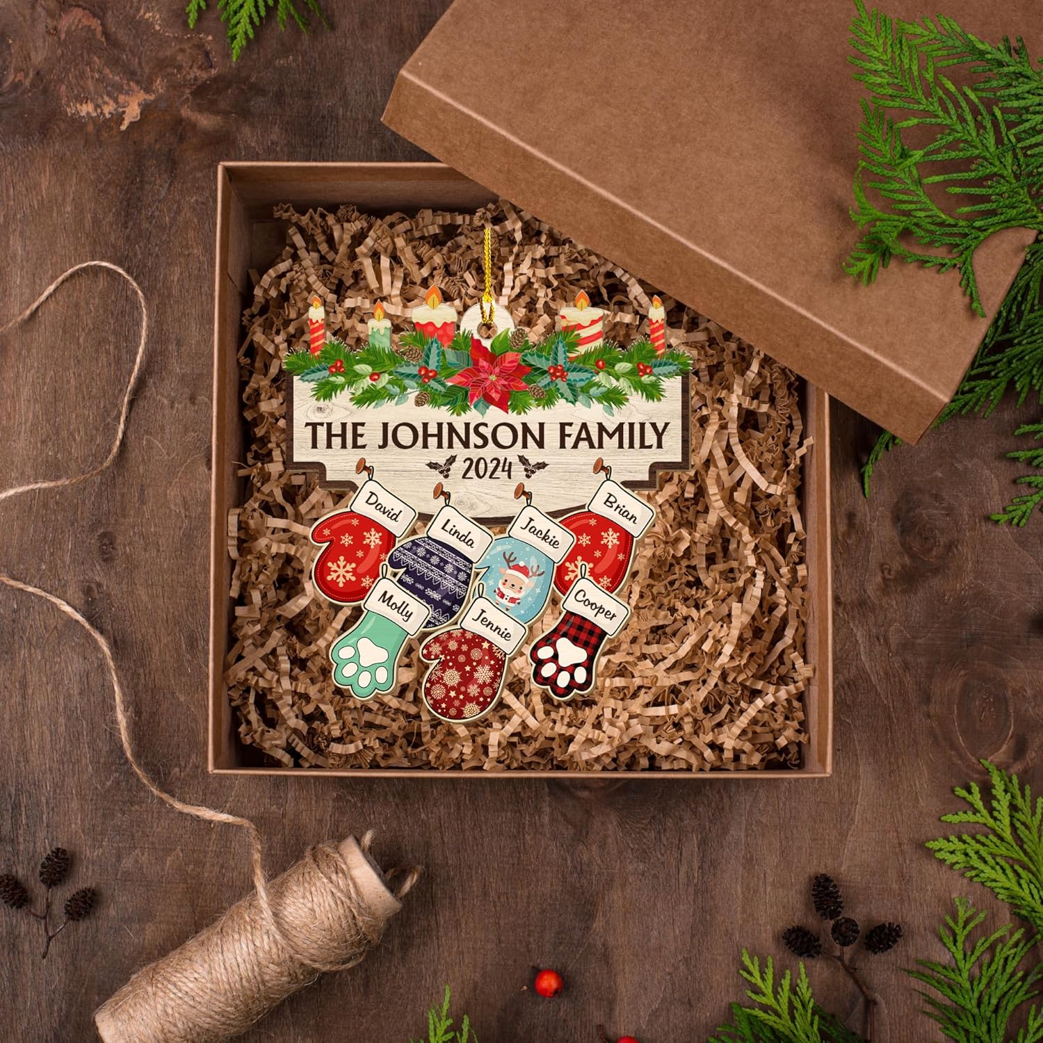 • 🐾 Perfect for Families with Pets - This ornament is designed to include everyone in the family, even furry friends! Choose gloves for each family member and stockings for pets, each with a custom name. It’s the perfect keepsake to represent the whole family in festive style.