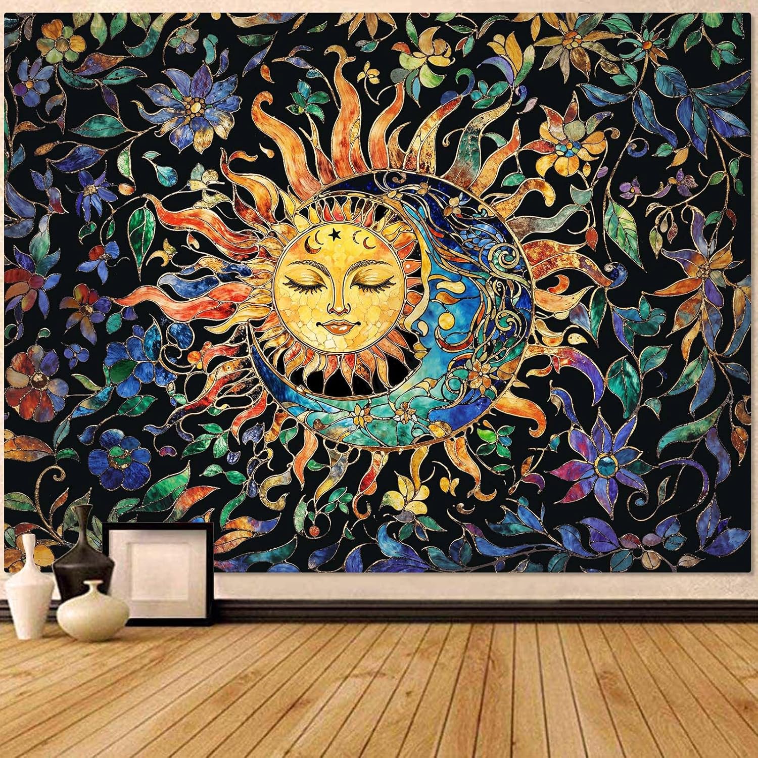 • Unique Stained Glass Design: This tapestry for bedroom features a stunning sun and moon pattern, enhanced with floral and plant branch elements, giving it a stained-glass-like aesthetic that adds a touch of elegance and mystery to any room