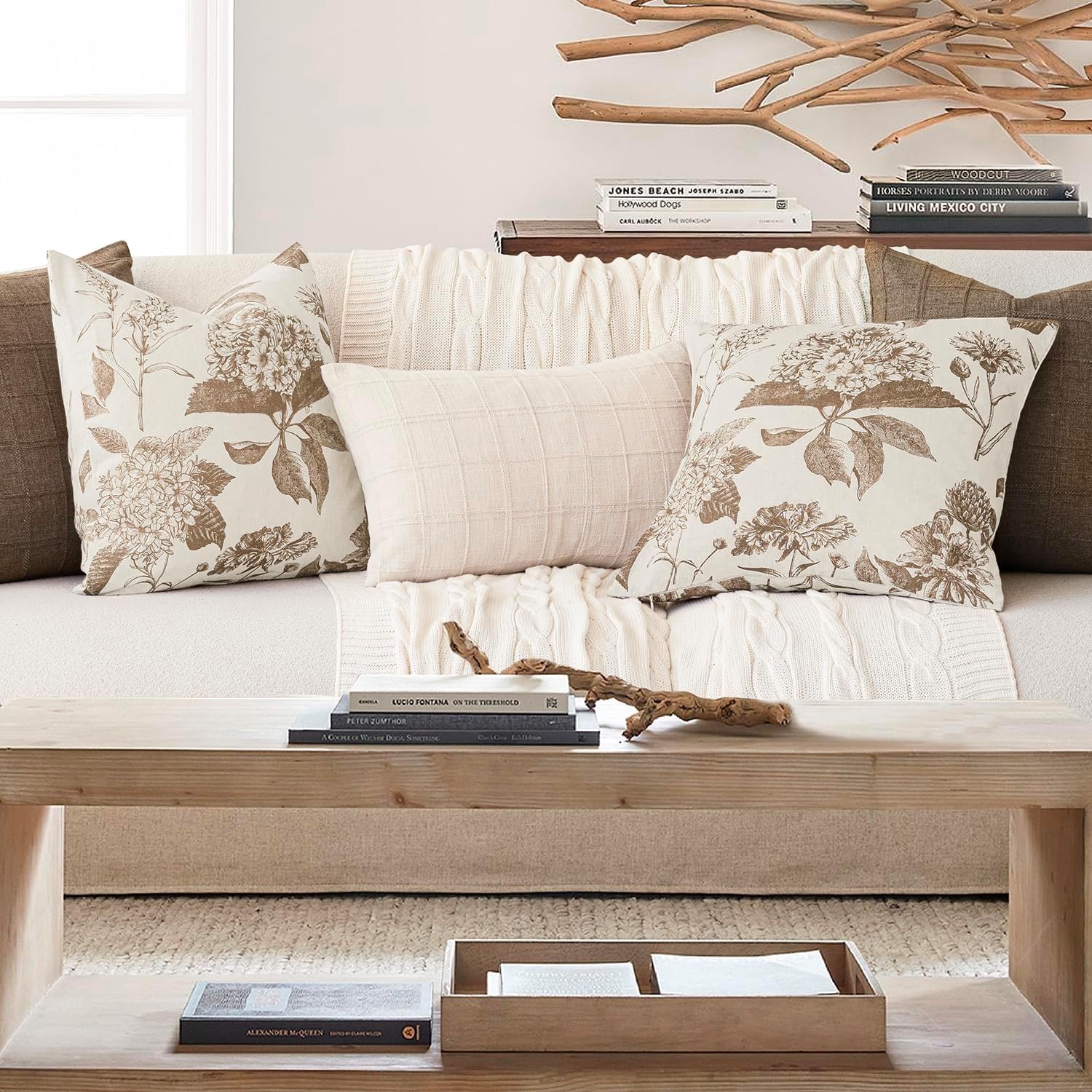 Foindtower Set of 2 Linen Floral Vintage Throw Pillow Covers Neutral Accent Decorative Cushion Covers Farmhouse Boho Home Decor for Sofa Chair Couch Bedroom Living Room Outdoor,18×18 Inch,Light Brown