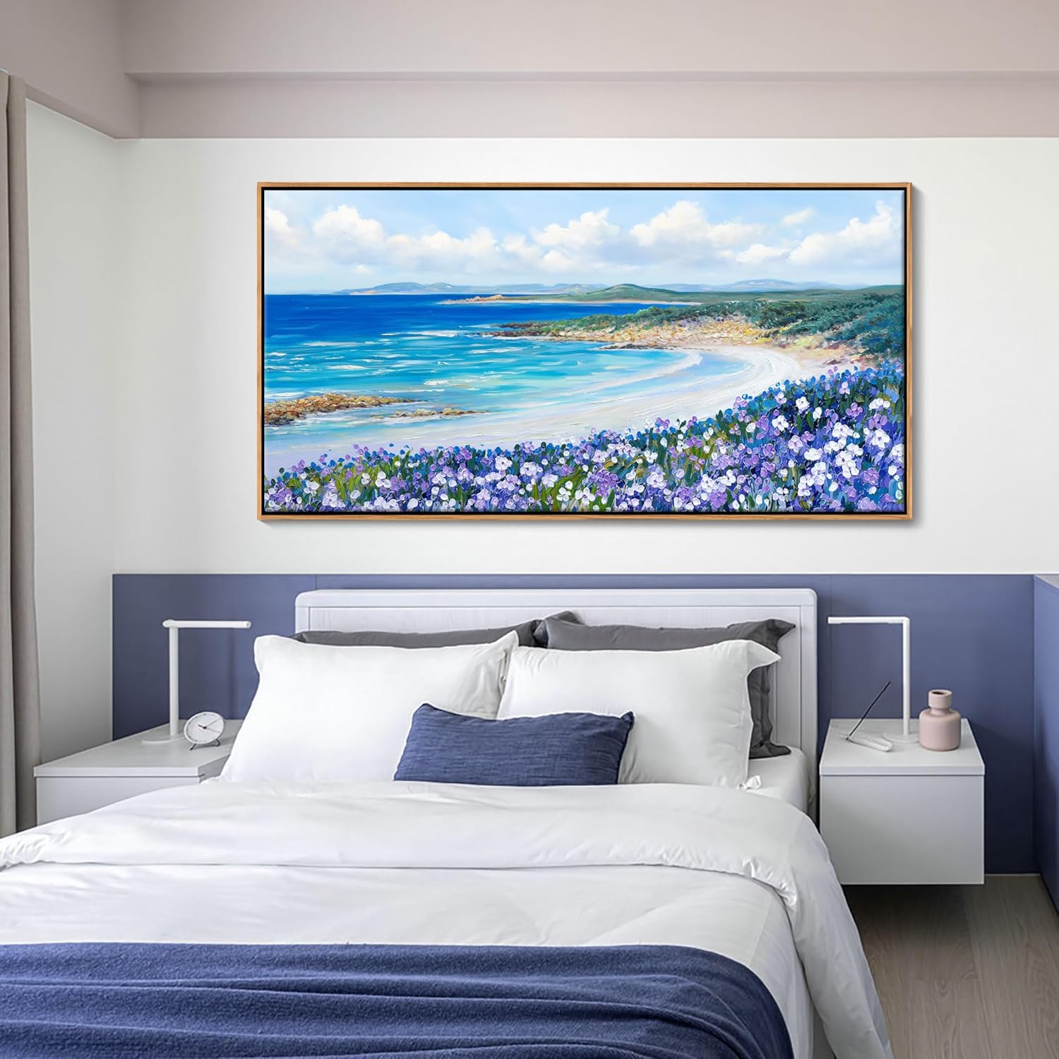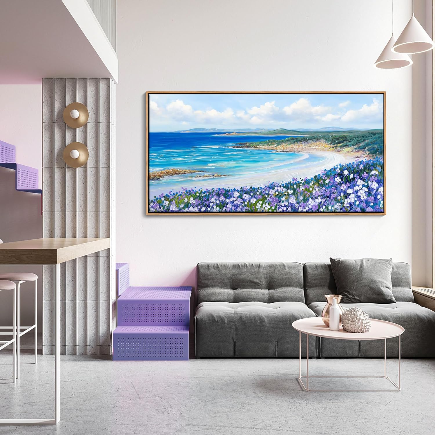 Mofutinpo Coastal Beach Wall Art,Large Purple Flower Landscape Canvas Wall Art for Living Room & Bedroom Decor, Framed Blue Beach Pictures & Paintings for Walls,Ocean Artwork for Home & Office 24x48IN
