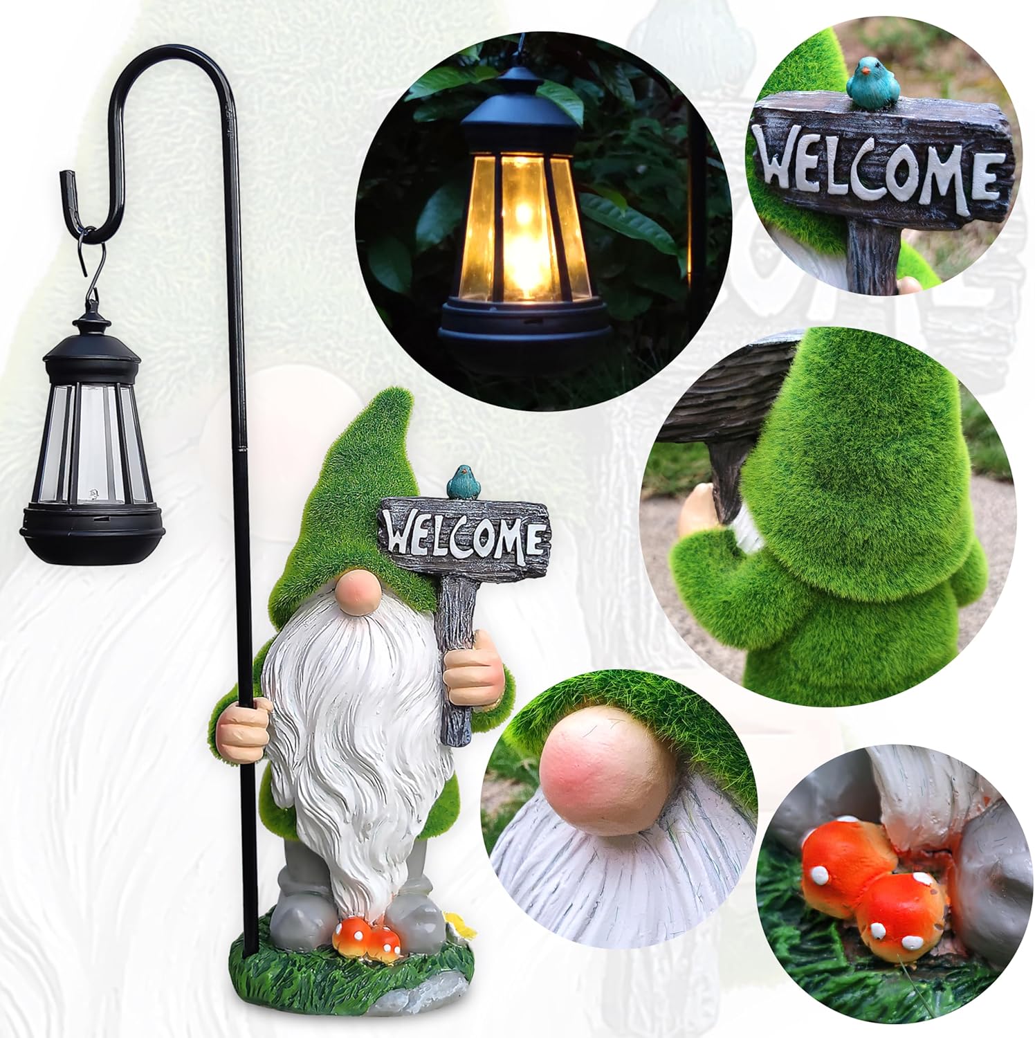 • 【Unique design】This charismatic gnomes gracefully holding a solar lantern, adds a touch of magic to your outdoor space, casting a warm and welcoming glow.The size of this gnomes figurine is 9.8X6.3X4.1inches,the lantern is 5.5X2.75X2.75inches.The gnomes figurines made of resin material, hand-painted and finished with a UV resistant coating can withstand rain, snow or scorching sun without fading.