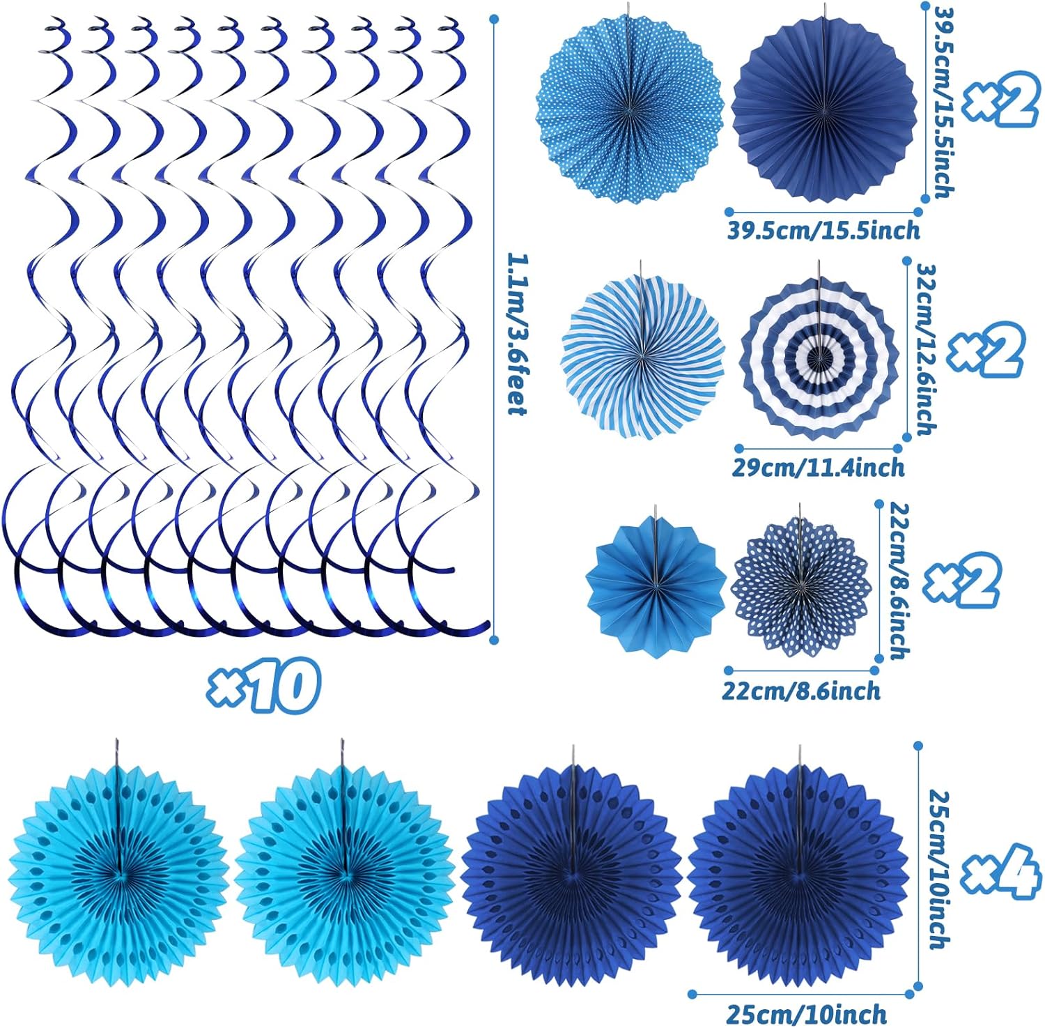 • 【What you will get】6 x Paper Fan, 4 x Paper Honeycomb Ball , 4 x Paper Hollow Fan, 10 x Hanging Swirl, 1 x Paper Hot Air Balloon Garland,1 x Triangular Pennant Garland, 1 x Circle Paper Garland. ( Color: Blue)