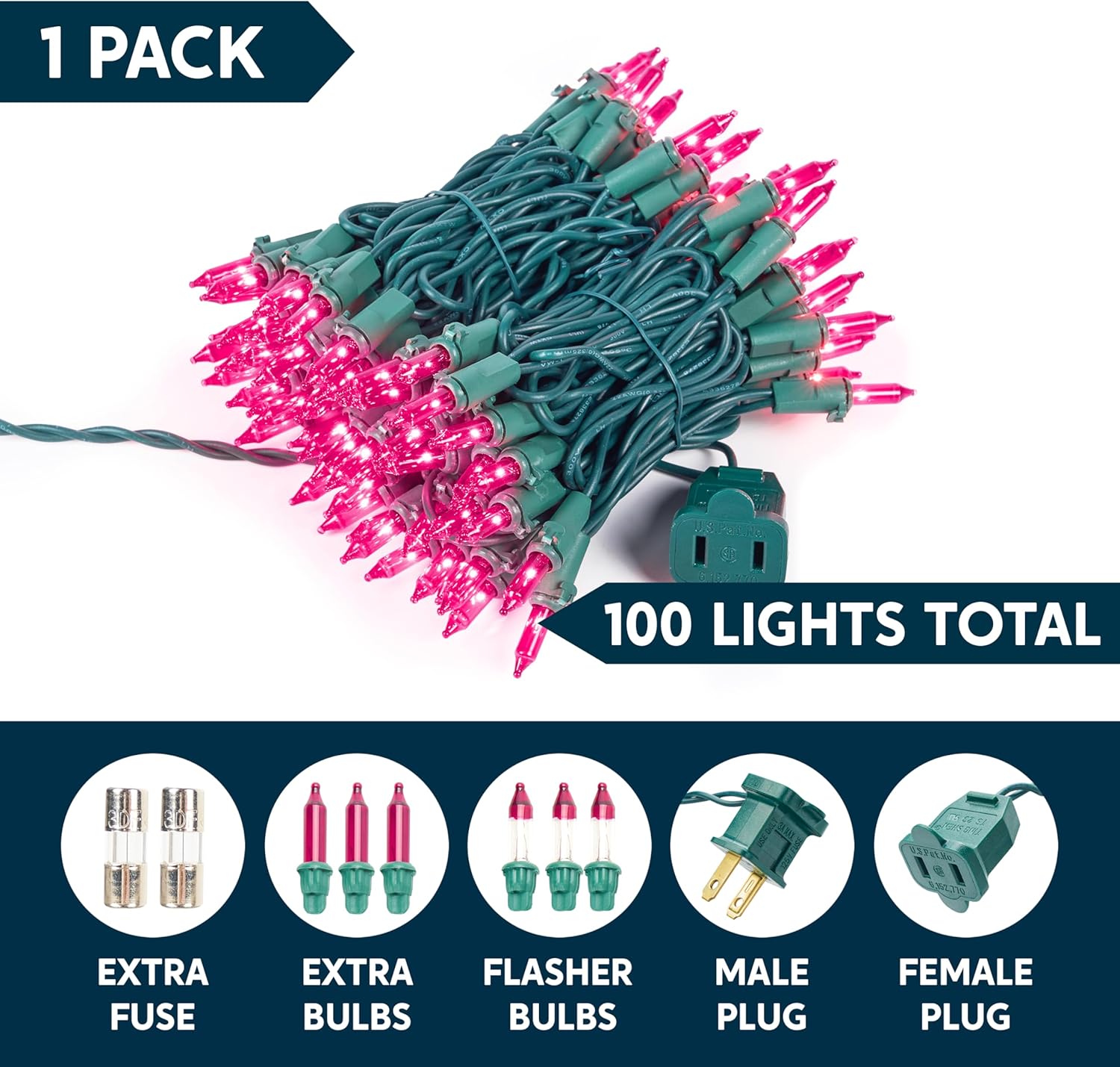 • Premium Quality. Our incandescent pink Christmas string lights are designed with strong durability to accommodate harsh weather conditions. Includes spare bulbs, flashes, and fuses. If one bulb burns out, the others stay lit.