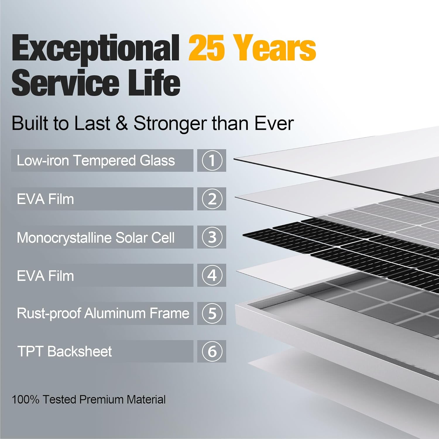 • 【Dependable Customer Support】- This solar panel is backed by a 25-year power output assurance and a 5-year material and workmanship. Additionally, our 24/7 customer service team is available to address any inquiries or issues you might have