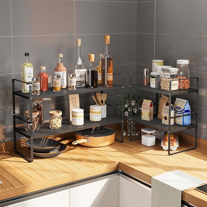 • Expandable and Stackable Shelves:Cabinet organizers choose 4 heights according to the space requirements, kitchen cabinet organizer length from 16.5"-27" free and thorough change, enjoy the fun of storage. Spice rack stacking design, greater increase your storage space.