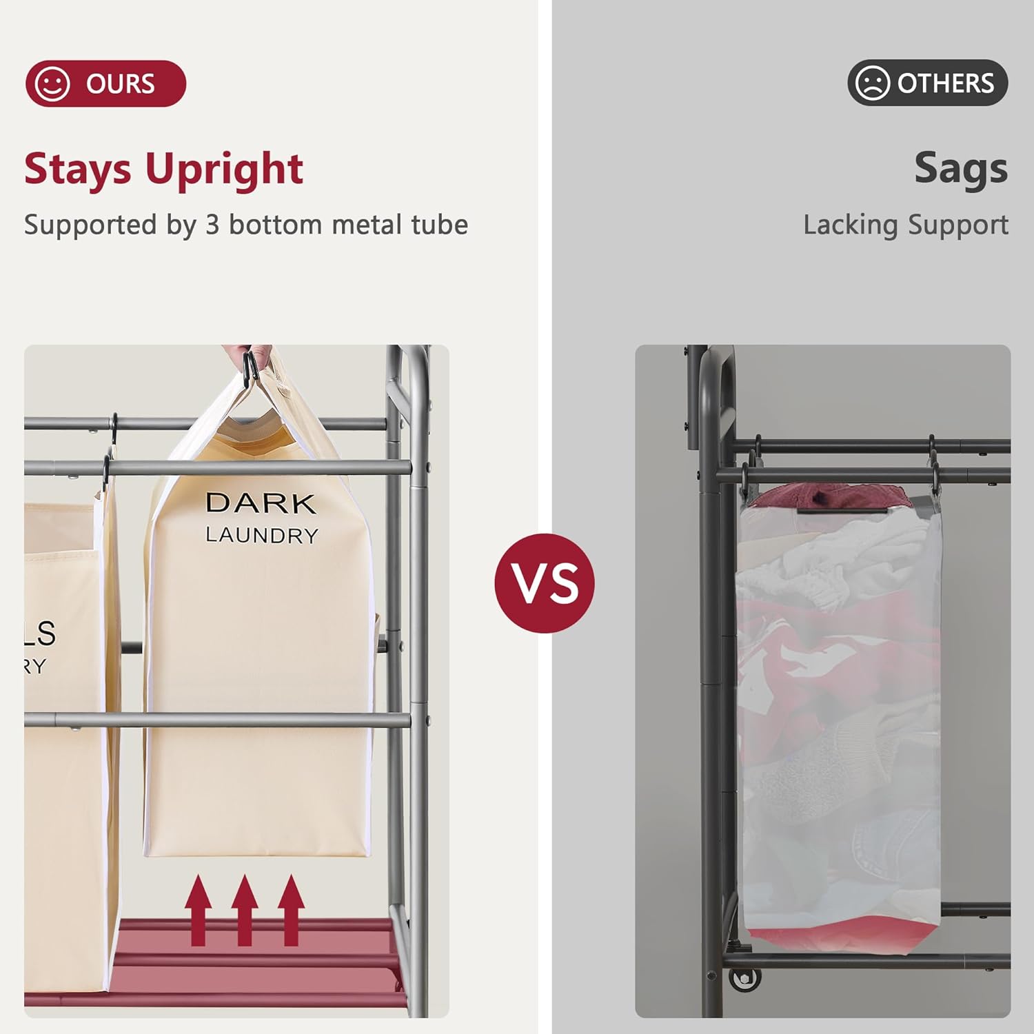 • 【Sturdy Frame】Made of heavy-duty metal frame that can hold up to 88 lbs. 7 Extra horizontal bars make the frame sturdy and prevent the bag from sagging when filled with laundry.