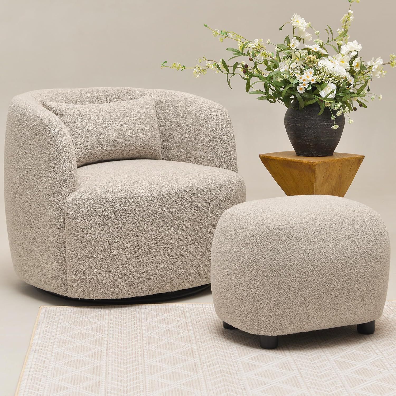 • Package Includes: 2 x boucle swivel barrel chairs (Dimensions: 32.7"D x 34"W x 29"H, no assembly, one toss pillow); 2 x boucle upholstered ottomans (Dimensions: 18.5"D x 23"W x 16.5"H, simply screw legs into pre-threaded holes). Two throw pillows includes in this living room boucle chair ottoman furniture set.