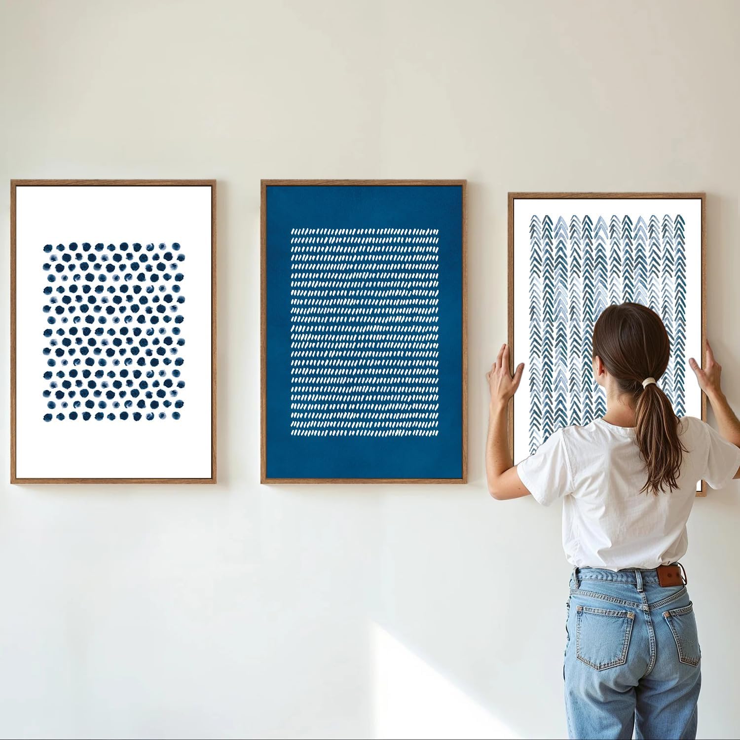 • Sleek Minimalist Design: This art set features a contemporary minimalist style with an abstract collage of navy light blue and white dots and lines, making it an ideal choice for those who appreciate simplicity and elegance in their home decor.