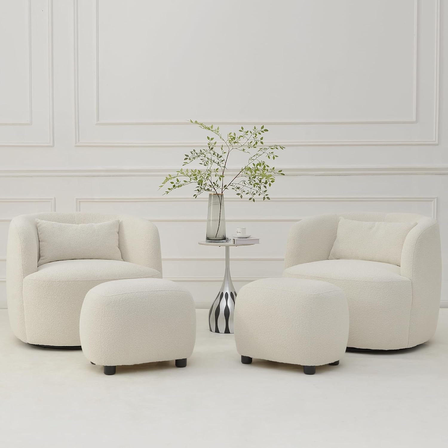 • Package Includes: 2 x boucle swivel barrel chairs (Dimensions: 32.7"D x 34"W x 29"H, no assembly, one toss pillow); 2 x boucle upholstered ottomans (Dimensions: 18.5"D x 23"W x 16.5"H, simply screw legs into pre-threaded holes). Two throw pillows includes in this living room boucle chair ottoman furniture set.