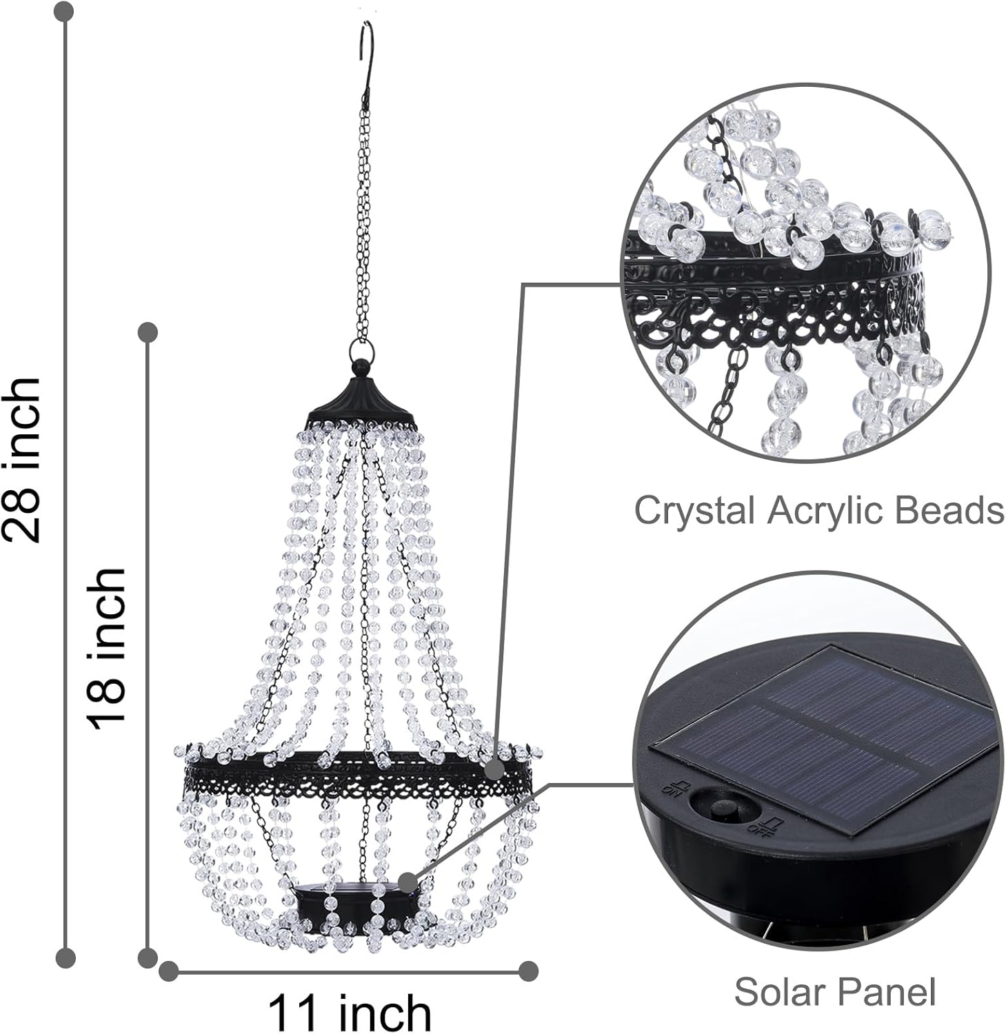 • Wide Application: This gorgeous crystal chandelier is not only a lamp, but also an eye-catching decoration. This solar powered chandelier can be hung from branches and decking, adding style and sparkle to your weddings and other festival events