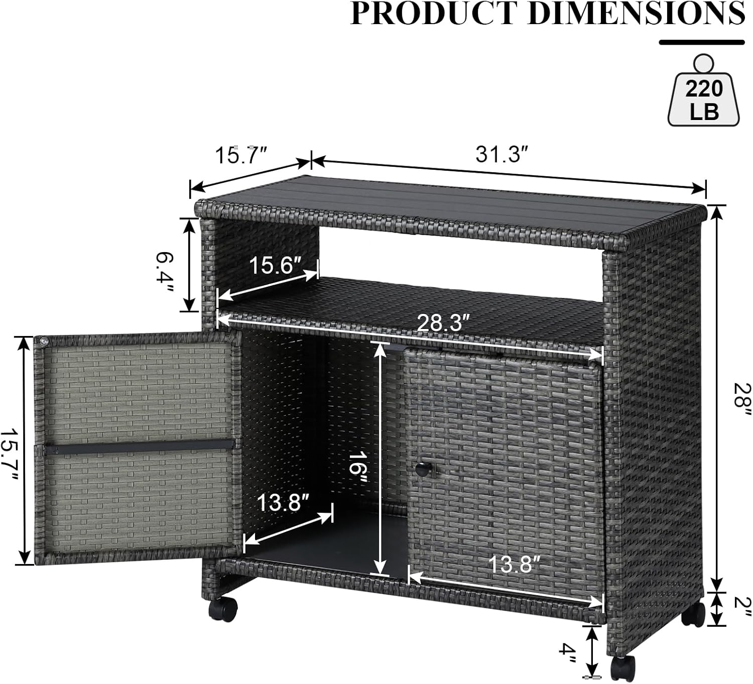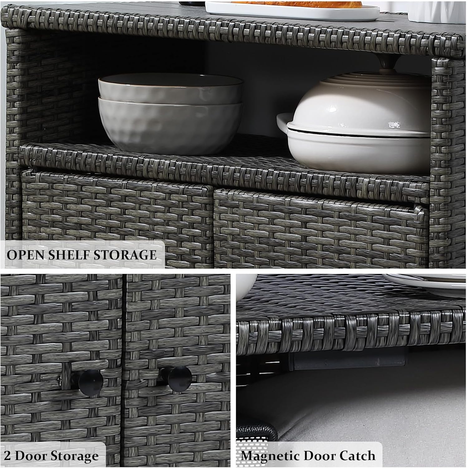 • Large Storage Capacity: Our wicker storage cabinet features a spacious tabletop, an open shelf and an enclosed cabinet. Our cabinet can be used as an outdoor buffet cabinet, garden tools cabinet, or bar table with elegant design