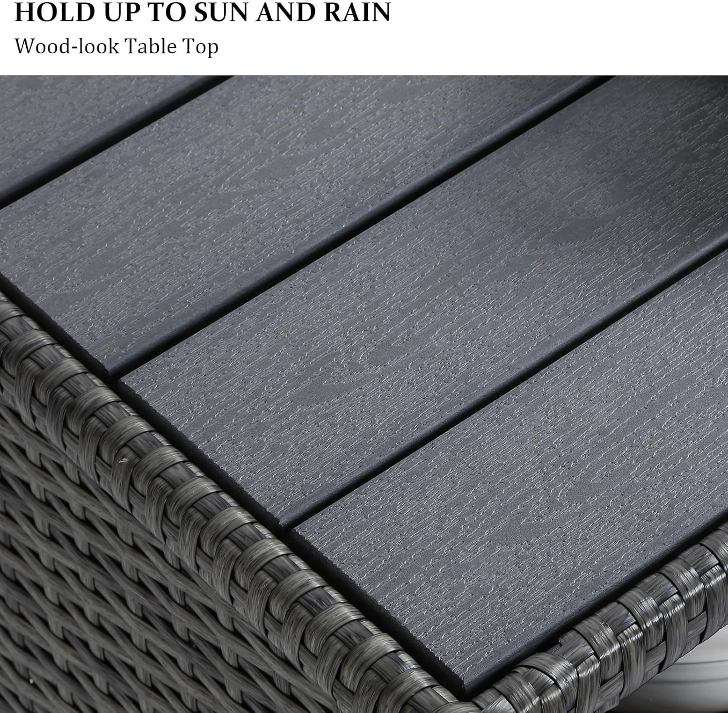 • Resin Faux Wood Top: Wicker Outdoor Bar Table with resin wood Tabletop, that mimics the look and feel of real wood.The resin wood top surface makes cleaning a cinch – a quick wipe with a damp cloth is all it takes. The sturdy steel frame of wicker storage cabinet that has been specially treated to withstand potential corrosion over time