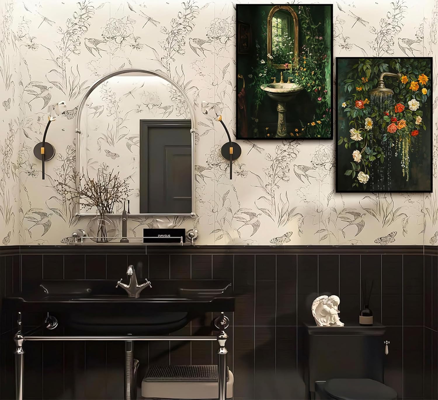 3Pcs Vintage Dark Green Bathroom Wall Art Shower Toilet Paper Roll Floral Poster Print Modern Farmhouse plants Painting Picture Wall Decor For Bathroom Living Room Decoration Unframed