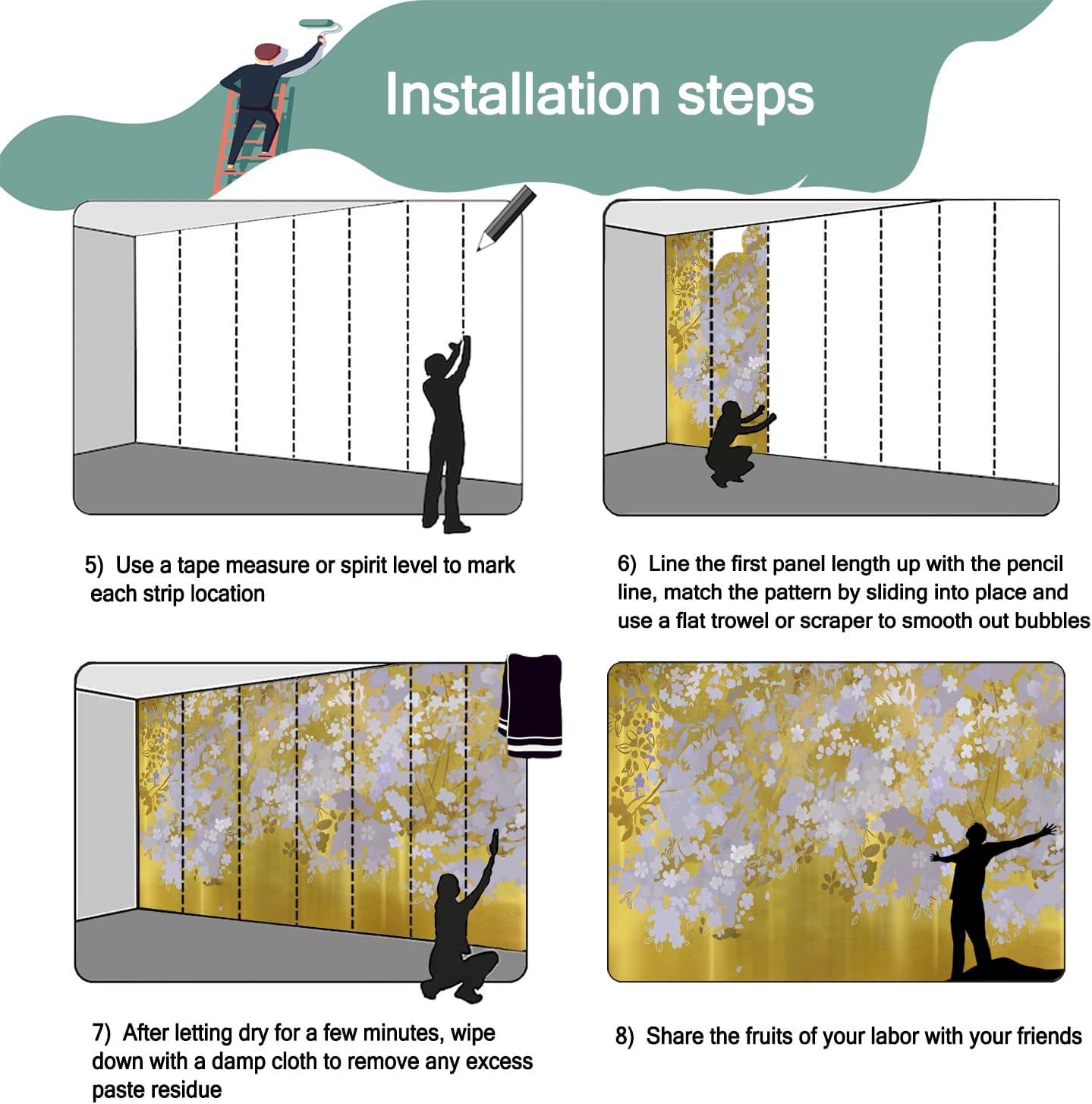 • Mural wallpaper size: 140 "W x 91 "H, divided into 7 sections, each section is labeled with a number underneath, there is no need to overlap the pattern when installing, just install according to the number labeled underneath the panel